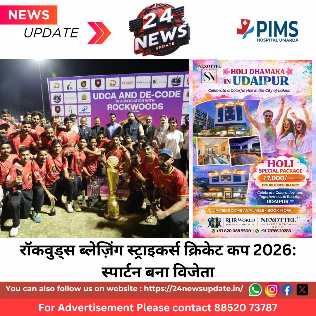 24 News Update उदयपुर। स्पार्टन क्रिकेट एकेडमी ने शानदार प्रदर्शन करते हुए सीपीएस, मेवाड़ रॉयल्स को 93 रनों से पराजित कर रॉकवुड्स ब्लेज़िंग स्ट्राइकर्स क्रिकेट कप 2026 का खिताब अपने नाम कर लिया।फाइनल मुकाबले में स्पार्टन क्रिकेट एकेडमी ने पहले बल्लेबाजी का फैसला किया और निर्धारित 20 ओवर में 8 विकेट खोकर 189 रन बनाए। टीम की ओर से रवि बिश्नोई ने मात्र 24 गेंदों में 52 रनों की विस्फोटक पारी खेली। शुभम गढ़वाल ने 20 गेंदों पर 45 रन और ध्रुव सिंह ने 28 गेंदों में 40 रन बनाकर टीम को मजबूत स्कोर तक पहुंचाया।गेंदबाजी में पुष्पेंद्र सिंह ने 3 विकेट और अनिरुद्ध सिंह ने 2 विकेट हासिल किए।लक्ष्य का पीछा करने उतरी सीपीएस, मेवाड़ रॉयल्स की टीम 17.5 ओवर में 96 रन पर ही ऑल आउट हो गई। टीम की ओर से पुष्पेंद्र सिंह ने 34 गेंदों में 31 रन बनाए।स्पार्टन की ओर से रवि बिश्नोई ने 3 विकेट जबकि गणेश और शिवम भानु ने 2-2 विकेट लेकर जीत सुनिश्चित की। शानदार बल्लेबाजी और गेंदबाजी प्रदर्शन के लिए रवि बिश्नोई को प्लेयर ऑफ द मैच चुना गया।पुरस्कार वितरण समारोह में मैच में अतिथि के रूप में श्रीजी हुजूर लक्ष्यराज सिंह मेवाड़ , महारानी निवृत्ति कुमारी, इंडियन प्लेयर भुवनेश्वर कुमार, शशीकांत खेतान (चेयरमैन एस के खेतान ग्रुप), दीपक शर्मा, ( डायरेक्टर रॉकवुड्स स्कूल), पुनीत गुप्ता, (कंट्री हेड, नुवामा ), फूलचंद शर्मा (क्रिकेट कोच), सिद्धार्थ सिंघवी (वाइस प्रेसिडेंट वंडर सीमेंट), अशोक मेनारिया (अंडर 19 इंडिया और रणजी ट्रॉफी प्लेयर), मनोज चौधरी ( सेक्रेटरी यूडीसीए, ) महेंद्र शर्मा (पूर्व राजस्थान क्रिकेट एसोसिएशन सेक्रेटरी) द्वारा पुरस्कार वितरण किया गया।विजेता टीम को 10 लाख रुपये एवं उपविजेता टीम को 5 लाख रुपये की पुरस्कार राशि प्रदान की गई। प्लेयर ऑफ द सीरीज का खिताब शुभम गढ़वाल को ट्रॉफी व ₹31,000 के साथ दिया गया। बेस्ट बैट्समैन भरत शर्मा को ट्रॉफी व ₹21,000 तथा बेस्ट बॉलर गणेश खुराना को ट्रॉफी व ₹21,000 प्रदान किए गए।यह जानकारी सुनील लड्ढ़ा (चेयरमैन रॉकवुड्स रॉकवुड्स ब्लेज़िंग स्ट्राइकर्स क्रिकेट) और विवेक घई (ऑर्गनाइजिंग सेक्रेटरी) द्वारा दी गई। मुख्य सलाहकार मनीष अग्रवाल, निदेशक अब्राहम कुमार भी उपस्थित रहे। Share this: Share on X (Opens in new window) X Share on Facebook (Opens in new window) Facebook More Email a link to a friend (Opens in new window) Email Share on WhatsApp (Opens in new window) WhatsApp Like this:Like Loading... Related Discover more from 24 News Update Subscribe to get the latest posts sent to your email. Type your email… Subscribe Post navigation उभरते क्रिकेट सितारे से मुलाकात: वरड़ा के विद्यार्थियों ने ली प्रेरणा प्राणायाम के माध्यम से स्वस्थ जीवन शैली अपनाने के संदेश के साथ एनएसएस शिविर का समापन