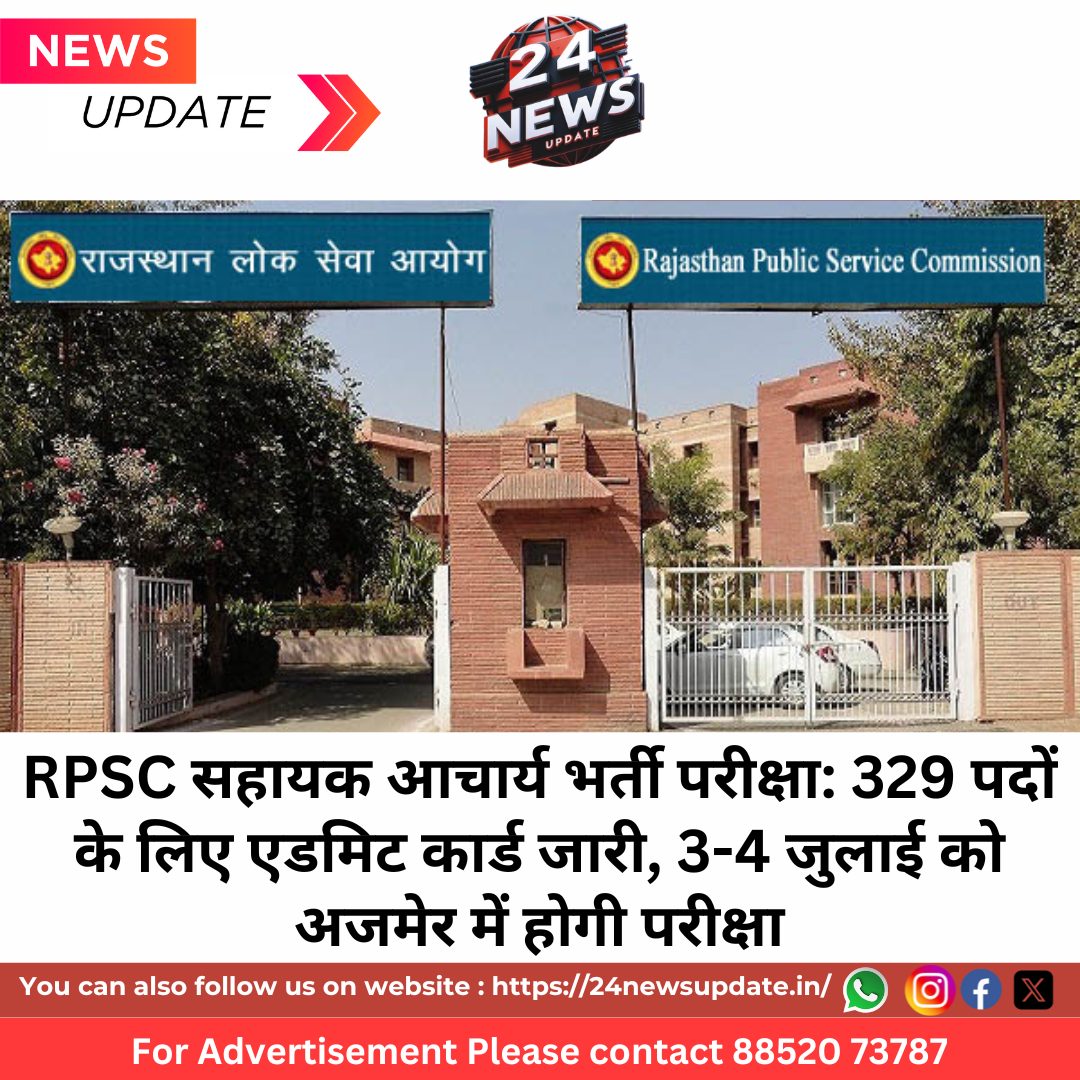 24 News Update अजमेर। राजस्थान लोक सेवा आयोग (RPSC) की ओर से चिकित्सा शिक्षा विभाग में सहायक आचार्य (Assistant Professor) भर्ती परीक्षा 3 और 4 जुलाई 2025 को अजमेर जिला मुख्यालय पर आयोजित की जाएगी। 329 पदों के लिए होने वाली इस परीक्षा के एडमिट कार्ड आयोग की वेबसाइट और एसएसओ पोर्टल पर अपलोड कर दिए गए हैं।