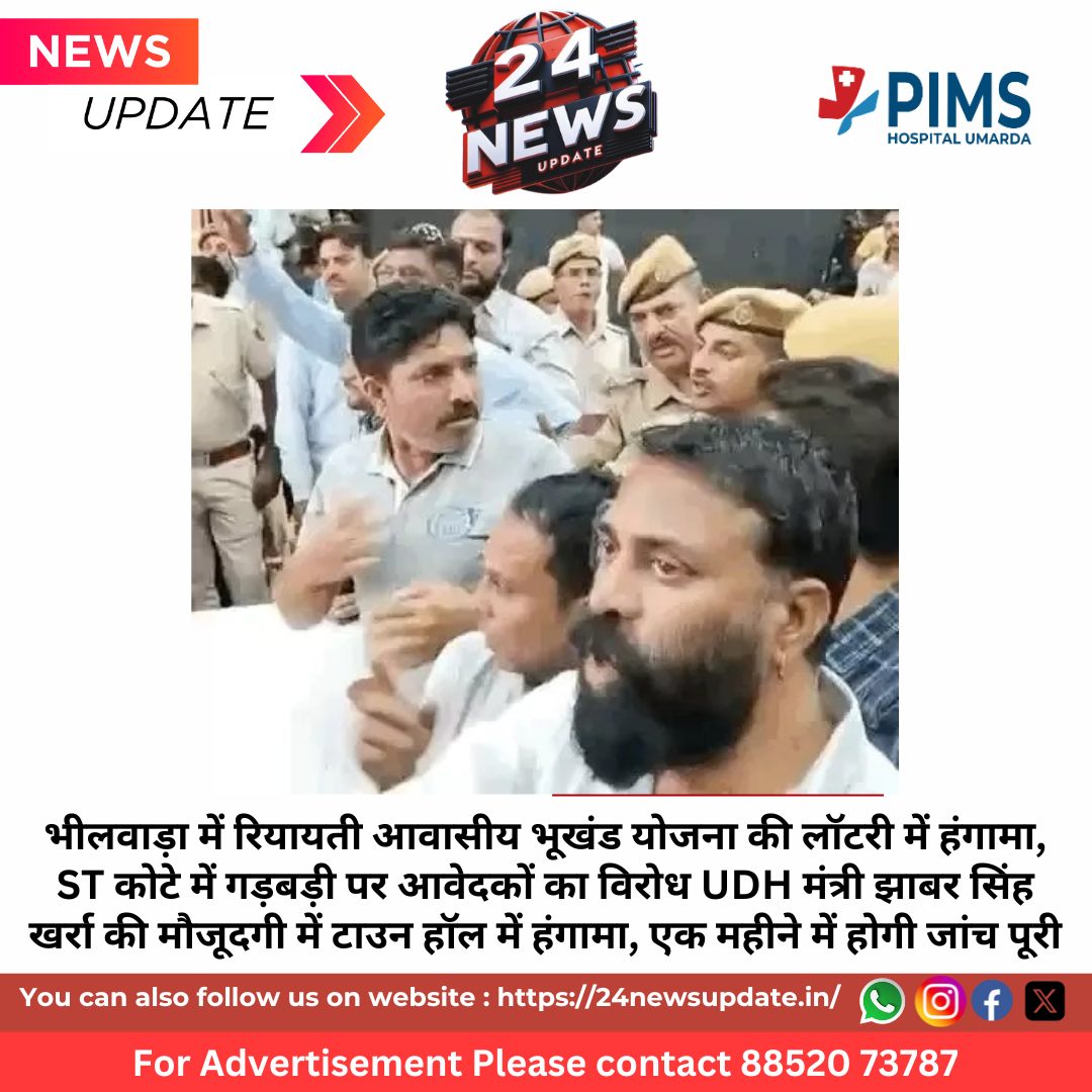 24 News Update भीलवाड़ा। नगर निगम टाउन हॉल में गुरुवार को आयोजित रियायती आवासीय भूखंड योजना की लॉटरी प्रक्रिया उस समय विवादों में घिर गई जब ST (अनुसूचित जनजाति) कोटे में अन्य वर्गों के नाम निकलने पर आवेदक भड़क उठे। मौके पर मौजूद UDH मंत्री झाबर सिंह खर्रा की मौजूदगी में लोगों ने जोरदार हंगामा किया और लॉटरी निरस्त करने की मांग उठाई।