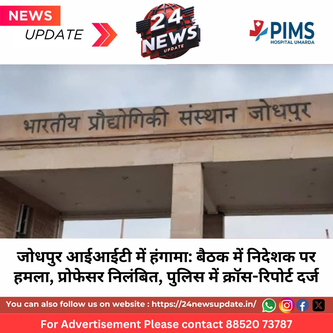 24 News Update जोधपुर। इंडियन इंस्टीट्यूट ऑफ टेक्नोलॉजी (आईआईटी) जोधपुर में मंगलवार को हुई एक चौंकाने वाली घटना ने कैंपस का माहौल गर्मा दिया। केमिकल इंजीनियरिंग विभाग की बैठक के दौरान एसोसिएट प्रोफेसर डॉ. दीपक कुमार अरोड़ा ने निदेशक प्रो. अविनाश अग्रवाल पर हमला कर दिया, जिससे निदेशक घायल हो गए। घटना के बाद दोनों पक्षों ने पुलिस में रिपोर्ट दर्ज कराई है, जबकि आईआईटी प्रशासन ने आरोपी प्रोफेसर को तत्काल प्रभाव से निलंबित कर दिया है।