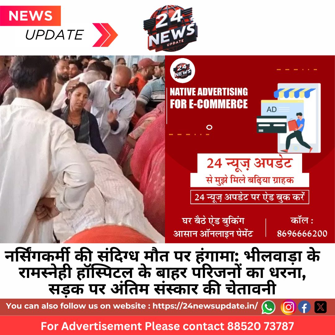 24 News Update भीलवाड़ा। रामस्नेही हॉस्पिटल में कार्यरत 30 वर्षीय नर्सिंगकर्मी भारती कंवर की संदिग्ध परिस्थितियों में मौत के बाद गुरुवार सुबह भीलवाड़ा में आक्रोश भड़क उठा। परिजनों ने अस्पताल प्रशासन पर मौत की जानकारी छिपाने का गंभीर आरोप लगाते हुए हॉस्पिटल के बाहर जोरदार विरोध प्रदर्शन किया और सड़क पर ही अंतिम संस्कार की चेतावनी दी। परिजनों का कहना है कि भारती की मौत बुधवार रात ड्यूटी के दौरान ही हो गई थी, लेकिन अस्पताल प्रशासन ने इस बात की सूचना गुरुवार सुबह करीब 5:30 बजे दी। जब परिवार के सदस्य अस्पताल पहुंचे, तब भारती का शव पहले ही एक एम्बुलेंस में रख दिया गया था, जिसे सरकारी अस्पताल की मोर्चरी ले जाने की तैयारी चल रही थी।