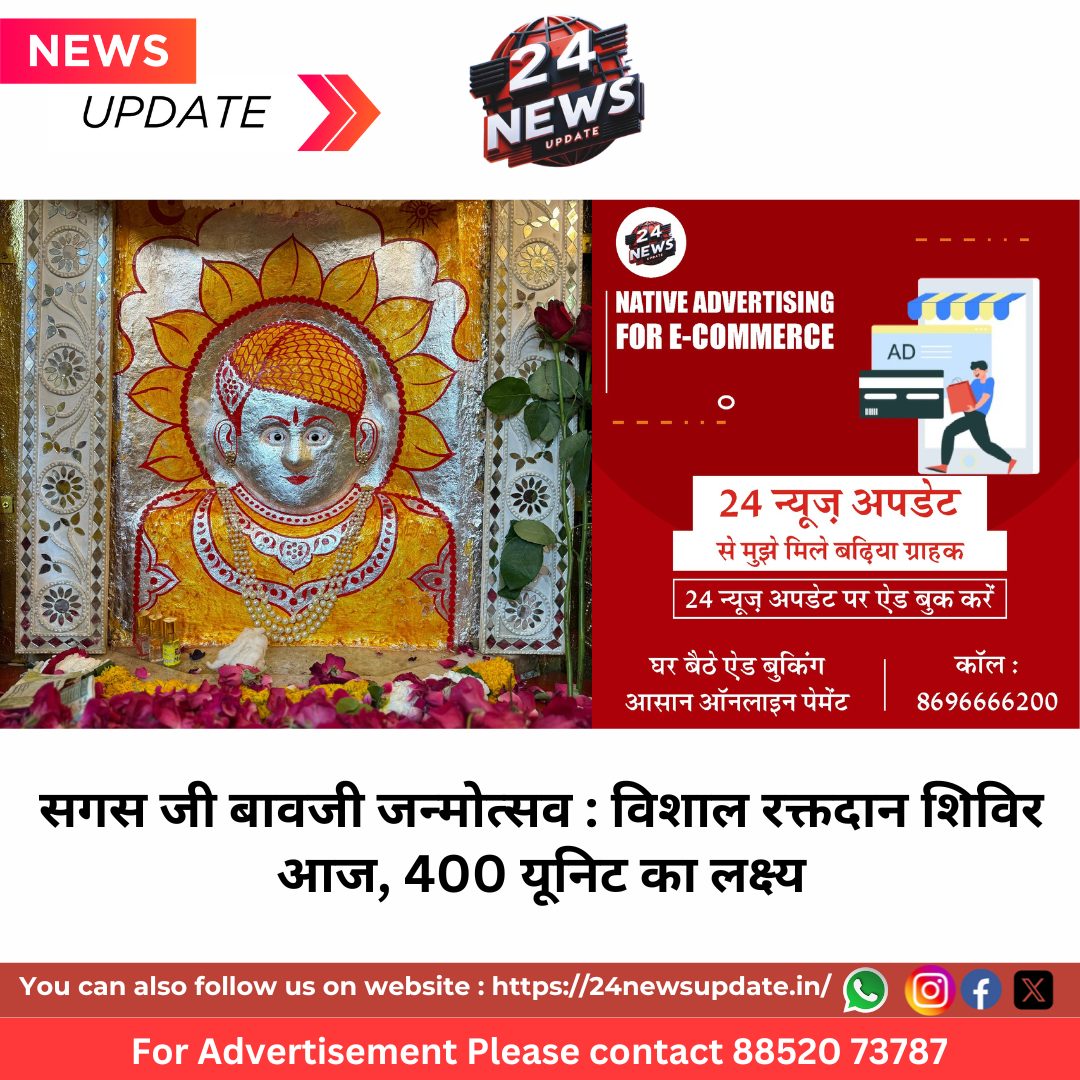 24 News Update उदयपुर। श्री श्री 1008 श्री सगस जी बावजी राज का जन्मोत्सव 1 अगस्त को मनाया जाएगा। इसी उपलक्ष्य में 18 जुलाई शुक्रवार को विशाल रक्तदान शिविर जनकल्याण की भावना से आयोजित किया गया है। सगस जी बावजी मंदिर, सर्वऋतु विलास, उदयपुर के पुजारी प्रकाश दशोरा ने बताया कि आरएनटी मेडिकल कॉलेज एवं सरल ब्लड बैंक के तत्वाधान में विशाल रक्तदान शिविर का आयोजन 18 जुलाई 2025 शुक्रवार को प्रातः 9 बजे से सायं 9 बजे तक मंदिर प्रांगण, सर्वऋतु विलास में किया जाएगा। रक्तदान शिविर का आयोजन श्री सगस जी बावजी भक्त मंडल सर्वऋतु विलास एवं युवा रक्तदाता वाहिनी के सानिध्य में संपन्न होगा।