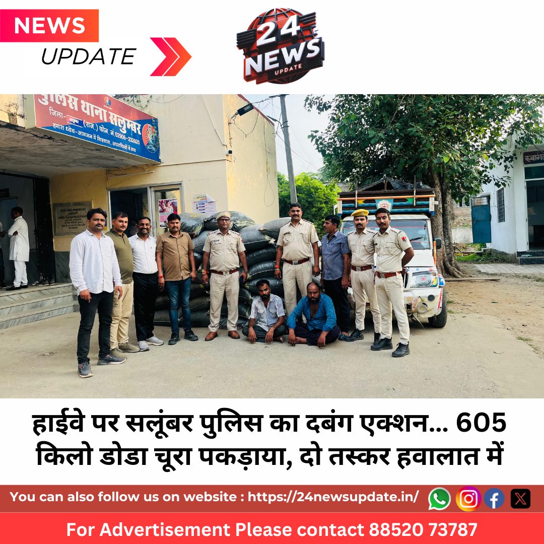 24 News Update सलूम्बर. जिला पुलिस अधीक्षक राजेश कुमार यादव के निर्देशन में सलूंबर थाना पुलिस ने अवैध मादक पदार्थ तस्करी के खिलाफ बड़ी सफलता हासिल की है। कार्रवाई में 605.54 किलो अवैध डोडा चूरा, जिसकी कीमत करीब 15 लाख रुपये है, बरामद किया गया। साथ ही परिवहन में प्रयुक्त पिकअप (नंबर RJ 27 GE 6004) जब्त कर दो तस्करों को गिरफ्तार किया गया।