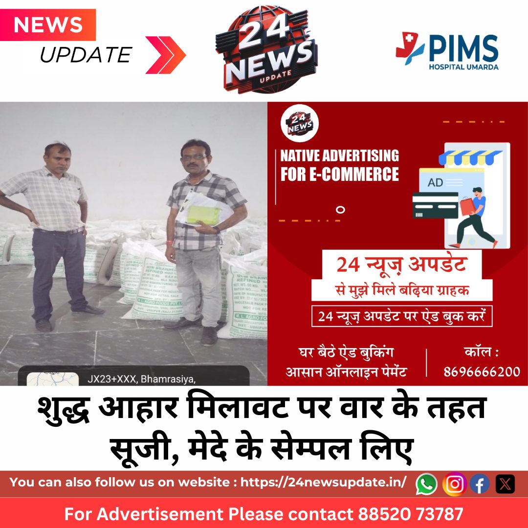 खाद्य सुरक्षा अधिकारी नरेंद्र सिंह चौहान ने एम एल एग्रो प्राइवेट लिमिटेड से सुजी और मेदे के सैंपल लिए। उक्त फर्मों को उचित डोक्युमेंट नहीं मिलने पर नोटिस दिया जाएगा। अभियान लगातार जारी रहेगा तथा मिलावटियों के खिलाफ सख्त कार्रवाई की जाएगी। नमूना मिसब्रांड पाये जाने पर 3 लाख रुपये तक, सब स्टैण्डर्ड पाये जाने पर 5 लाख, .रुपये तक जुर्माने एवं अनसेफ पाये जाने पर 6 माह से लेकर आजीवन कारावास एवं 1 लाख से लेकर 10 लाख रुपये तक जुर्माने का प्रावधान है।