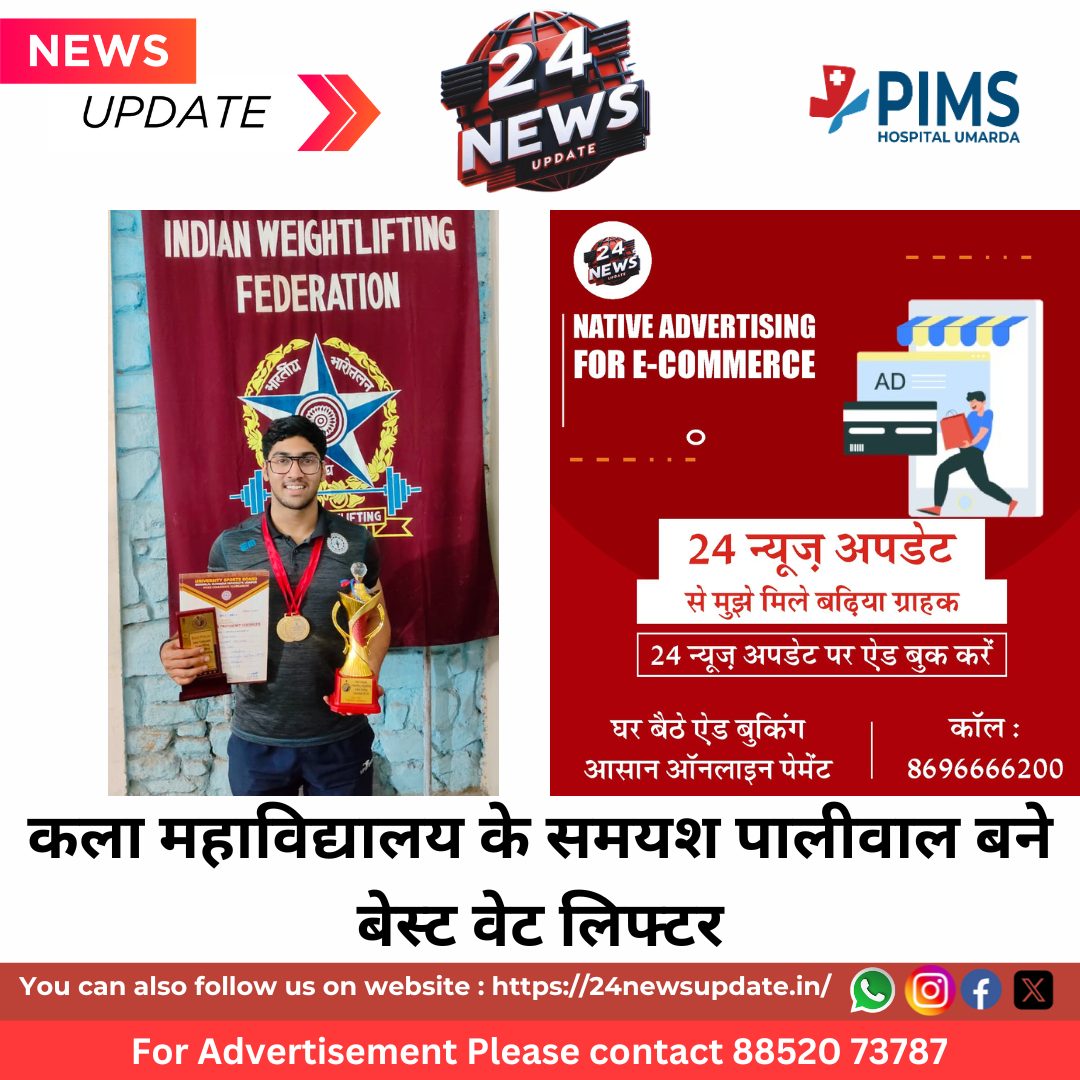 24 news Update उदयपुर। सुखाड़िया विश्वविद्यालय की अंतर-महाविद्यालय वेटलिफ्टिंग प्रतियोगिता में कला महाविद्यालय के समयश पालीवाल ने उत्कृष्ट प्रदर्शन करते हुए पुरुष वर्ग का बेस्ट वेट लिफ्टर खिताब जीता। वहीं महिला वर्ग में अपेक्षा पंवार को यह सम्मान मिला।