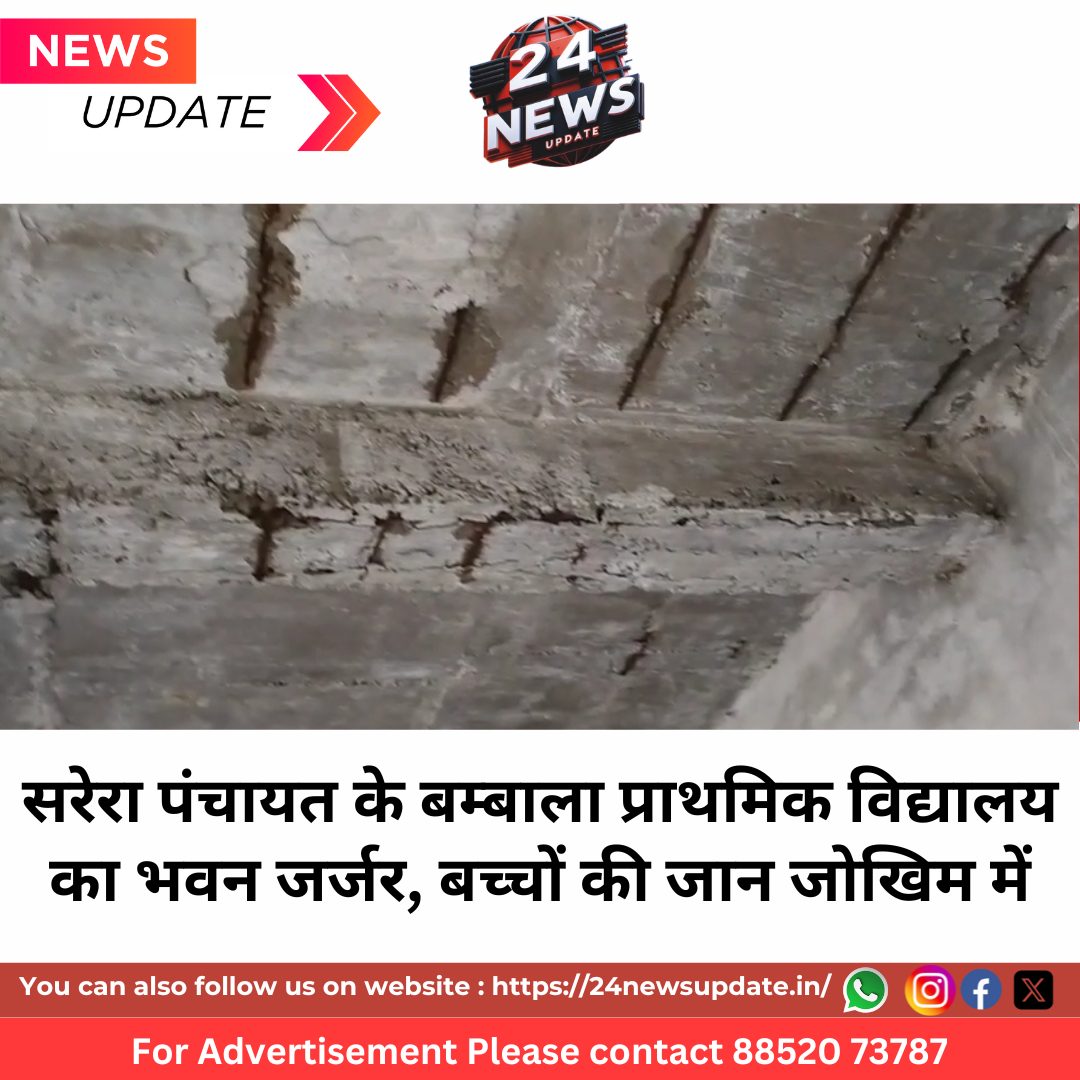 24 News Update खेरवाड़ा । उपखंड नयागांव की सरेरा ग्राम पंचायत स्थित प्राथमिक विद्यालय बम्बाला का भवन अत्यंत जर्जर स्थिति में पहुंच चुका है, जिससे विद्यार्थियों और शिक्षकों की सुरक्षा खतरे में पड़ गई है। विद्यालय भवन में कुल तीन कमरे और एक बरामदा मौजूद है, लेकिन उनमें से एक कमरा पूरी तरह क्षतिग्रस्त हो चुका है। उसकी छत का प्लास्टर झड़ चुका है और दीवारों में गहरी दरारें पड़ गई हैं। शेष एक कमरे में स्कूल का कार्यालय संचालित किया जा रहा है जबकि अन्य एक कमरे और बरामदे में कक्षा 1 से 5 तक की पढ़ाई कराई जा रही है। विद्यालय में वर्तमान में 46 छोटे-छोटे बच्चे शिक्षा प्राप्त कर रहे हैं, जिन्हें सिर्फ दो शिक्षक पढ़ा रहे हैं। सबसे चिंताजनक स्थिति यह है कि बरसात के मौसम में जर्जर छत के नीचे शिक्षण कार्य किया जा रहा है, जिससे किसी भी समय बड़ी दुर्घटना की आशंका बनी हुई है। शिक्षक बच्चों को भय के माहौल में पढ़ाने को विवश हैं।