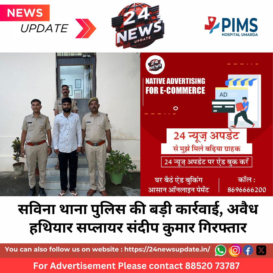 24 News Update उदयपुर। जिले की सविना थाना पुलिस ने अवैध हथियारों के विरुद्ध चलाए जा रहे विशेष अभियान के तहत बड़ी सफलता हासिल की है। पुलिस ने हथियार सप्लाई करने वाले मुख्य आरोपी संदीप कुमार (25) पुत्र शेर सिंह, निवासी नाटास, थाना गुढा गोडजी, जिला झुंझुनूं को गिरफ्तार किया है।