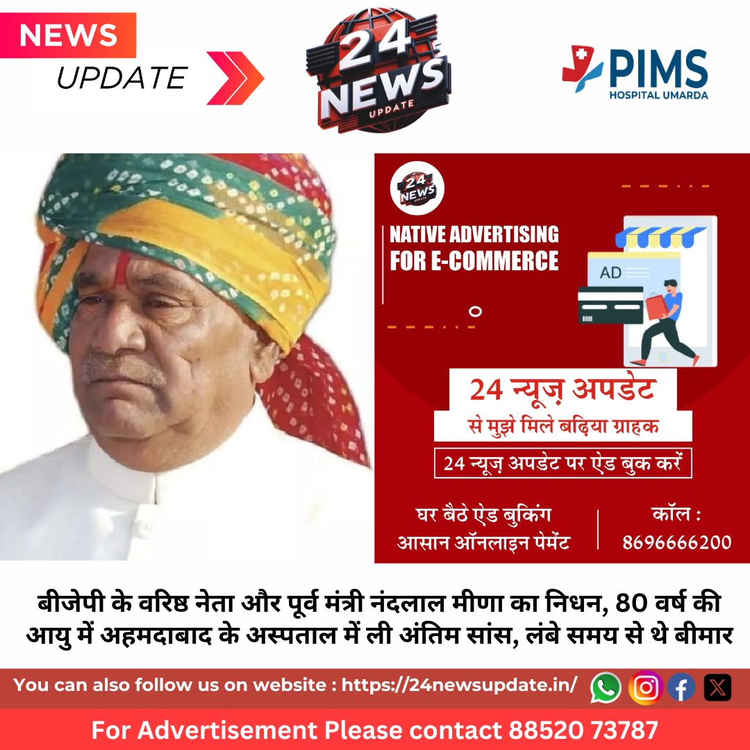 24 news Update उदयपुर/प्रतापगढ़। भाजपा के वरिष्ठ नेता और पूर्व जनजातीय कैबिनेट मंत्री नंदलाल मीणा का शनिवार को 80 वर्ष की आयु में निधन हो गया। वे लंबे समय से अस्वस्थ चल रहे थे और अहमदाबाद के एक अस्पताल में उनका उपचार चल रहा था। निधन की सूचना से आदिवासी अंचल सहित प्रदेशभर में शोक की लहर दौड़ गई। वर्तमान में उनके पुत्र हेमंत मीणा राजस्थान सरकार में कैबिनेट मंत्री हैं।