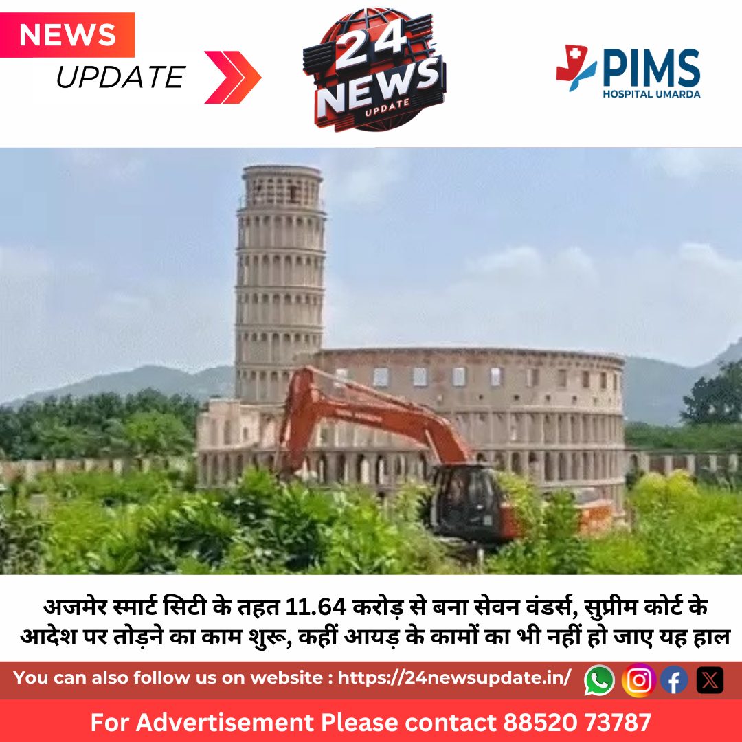 24 News Update अजमेर। सुप्रीम कोर्ट के आदेश के बाद आज से अजमेर में स्थित सेवन वंडर्स पार्क को तोड़ने की कार्रवाई शुरू कर दी गई है। यह पार्क स्मार्ट सिटी परियोजना के तहत 11.64 करोड़ रुपए की लागत से बनाया गया था, जिसमें दुनिया के सात अजूबों की प्रतिकृतियां स्थापित की गई थीं। इनमें ताजमहल, एफिल टॉवर, मिस्र के पिरामिड, पीसा की झुकी मीनार, रोम का कोलोसियम, स्टैच्यू ऑफ लिबर्टी और क्राइस्ट दी रिडीमर शामिल थे। इस कार्रवाई से खलबली मची हुई है और यह साफ हो गया है कि स्मार्ट सिटी के कामों में अफसरों ने जमकर मनमानियां की हैं। पर्यावरण के हितों का ध्यान नहीं रखा है।