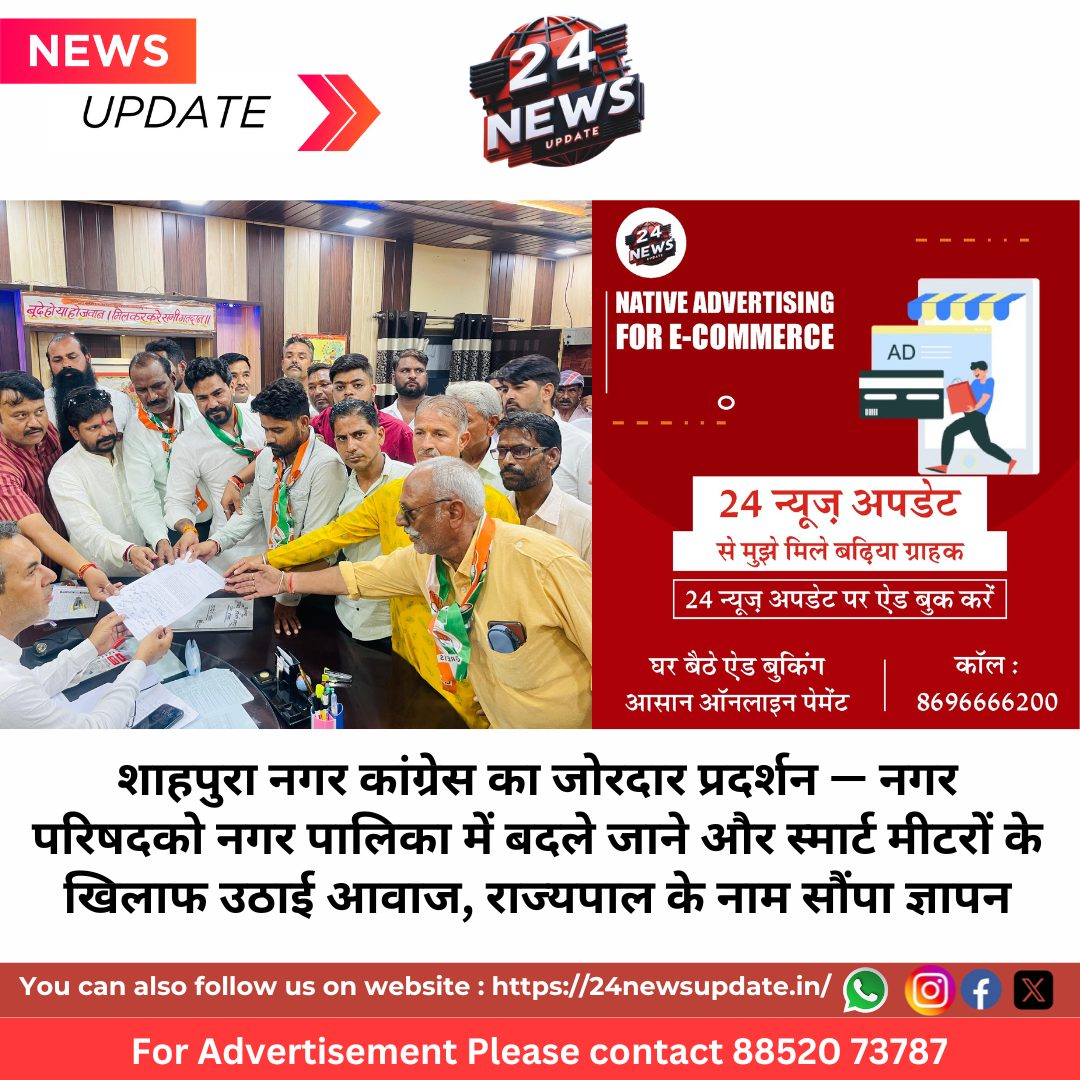 24 News Update शाहपुरा. शहर में नगर कांग्रेस द्वारा गुरुवार को उपखंड कार्यालय पर जोरदार प्रदर्शन किया गया। यह प्रदर्शन नगर परिषद को नगर पालिका में बदले जाने और शहर में लगाए जा रहे स्मार्ट मीटरों के खिलाफ था। कार्यकर्ताओं ने राज्यपाल के नाम ज्ञापन सौंपकर इन जनविरोधी फैसलों को तुरंत वापस लेने की मांग की।