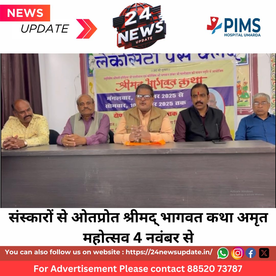 24 News Update उदयपुर। हिरणमगरी सेक्टर-4 स्थित वैद्य भगीरथ जोशी सभागार, विद्या निकेतन उच्च माध्यमिक विद्यालय में 4 नवंबर से 10 नवंबर तक श्रीमद् भागवत (संस्कार) कथा अमृत महोत्सव का भव्य आयोजन होने जा रहा है। इस सात दिवसीय धार्मिक आयोजन को लेकर शनिवार को लेकसिटी प्रेस क्लब में प्रेस वार्ता आयोजित हुई।