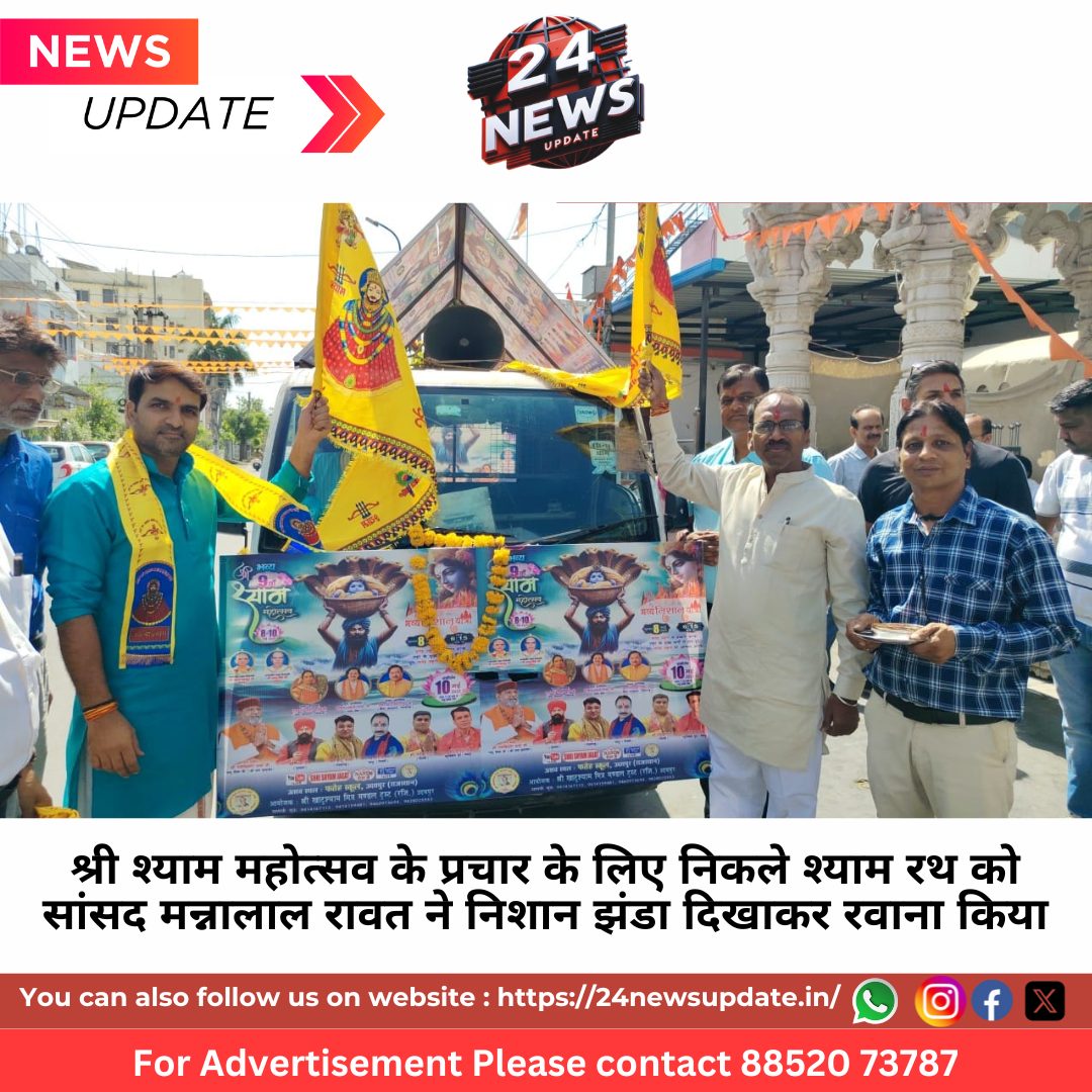 24 News Update. उदयपुर। श्री खाटू श्याम मित्र मण्डल ट्रस्ट की ओर से 8 से 10 मई तक आयोजित होने वाले 9वें भव्य श्री श्याम महोत्सव के प्रचार के लिए निकले श्री श्याम रथ को शनिवार सुबह सांसद डॉ मन्नालाल रावत ने बोहरा गणेशजी मंदिर से बाबा श्याम का निशान झंडा दिखाकर रवाना किया।