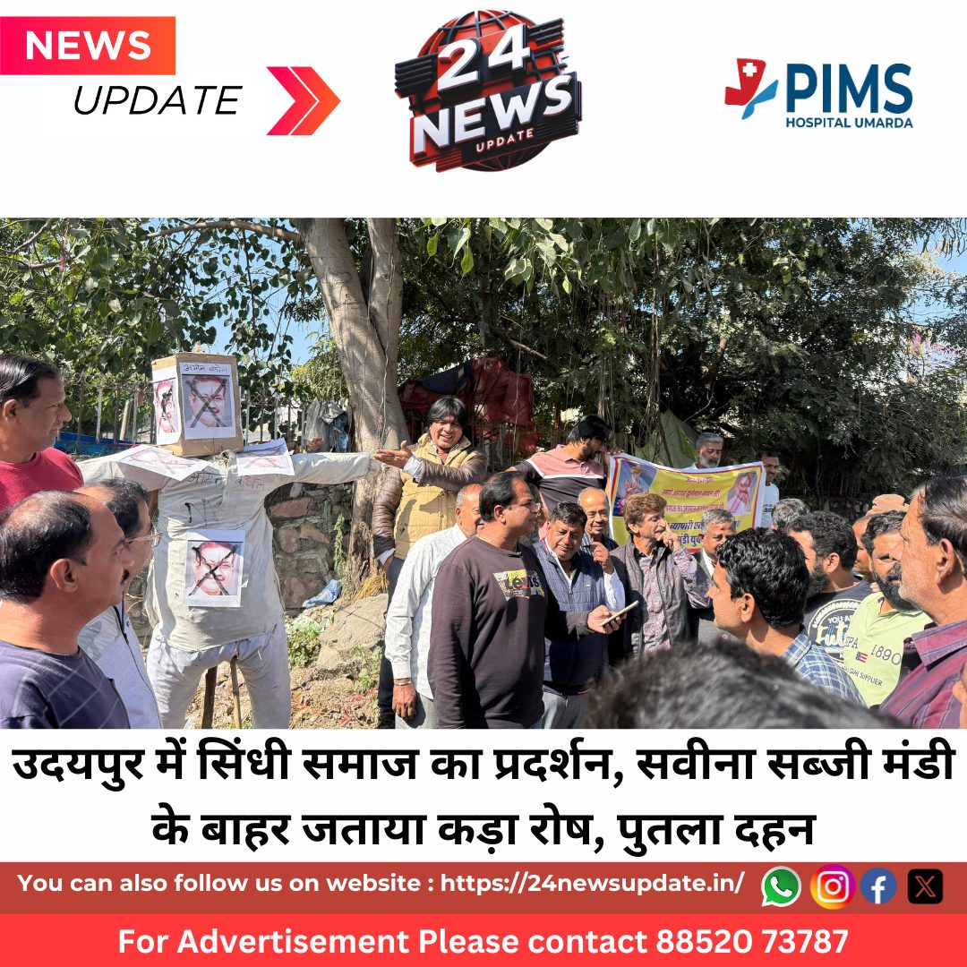 24 News Update उदयपुर। सवीना सब्जी मंडी के बाहर मंगलवार को सिंधी समाज एवं सर्व हिंदू समाज के व्यापारियों ने छत्तीसगढ़ क्रांति सेना के नेता अमित बघेल द्वारा सिंधी समाज और उनके आराध्य इष्ट देव श्री झूलेलाल के प्रति की गई कथित अपमानजनक टिप्पणियों के खिलाफ कड़ा विरोध दर्ज कराया। आक्रोशित व्यापारियों ने नारेबाजी करते हुए अमित बघेल का पुतला दहन किया और उनके खिलाफ सख्त कार्रवाई की मांग की।