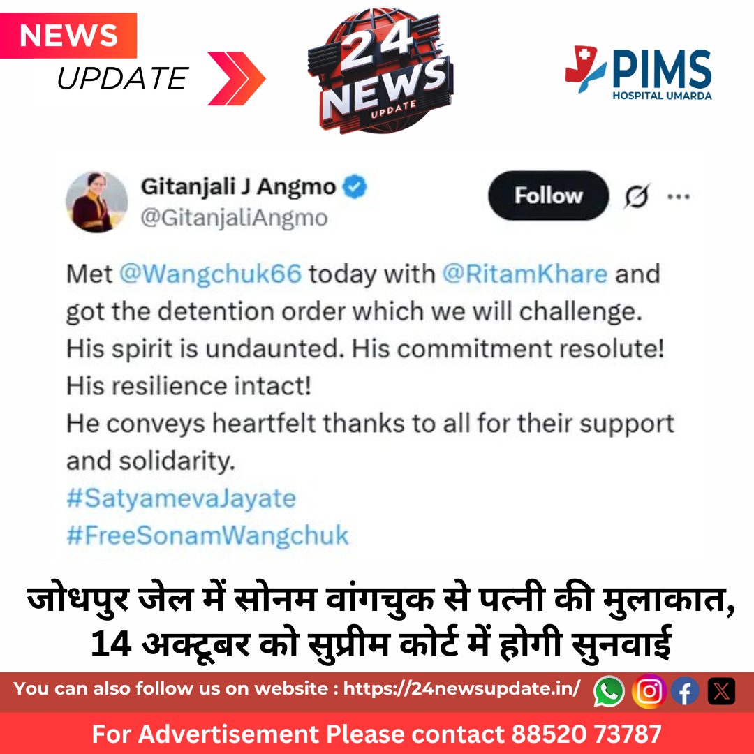 “आज रितम खरे के साथ वांगचुक से मुलाकात की। हमें डिटेंशन ऑर्डर मिला है, जिसे हम कानूनी रूप से चुनौती देंगे। इस दस्तावेज़ में एनएसए लगाने के सभी कारणों का विवरण है। अब हमारी कानूनी टीम इसे कोर्ट में चुनौती देने की तैयारी कर रही है।”