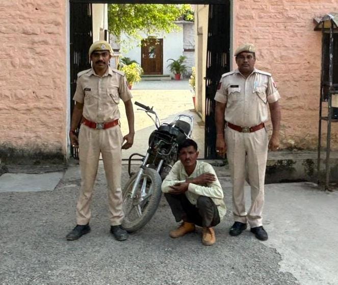 जिला पुलिस अधीक्षक मनीष त्रिपाठी ने बताया कि गत 09 सितंबर को अरनोदा निवासी रमेश नायक की मोटर साईकिल न्यायालय के गेट के बाहर से कोई अज्ञात बदमाश चुरा ले जाने के मामले में प्रकरण दर्ज कर अनुसंधान हैड कानि. मेघराज के जिम्मे किया गया। आरोपियों की गिरफ्तारी कर मोटर साईकिल बरामद करने के लिए एएसपी सरितासिंह के मार्गदर्शन व डीएसपी निम्बाहेड़ा बद्रीलाल राव के सुपरविजन में थानाधिकारी कोतवाली निम्बाहेडा रामसुमेर मीणा पु.नि. के निर्देश पर अनुसंधान अधिकारी हैड कानि. मेघराज, हरविन्द्रसिंह, कानि. हेमन्त कुमार व खुबीराम द्वारा मामले में माल मुल्जिमान की तलाश की। कस्बा निम्बाहेडा में लगे सी.सी.टी.वी कैमरो के नियन्त्रण कक्ष कस्बा पुलिस चौकी निम्बाहेडा पर फुटेज देखे गये तो घटना में चोरी हुई मोटर साईकिल को एक व्यक्ति ले जाता हुआ नजर आया, उक्त हुलिये के व्यक्ति की तलाश व आसूचना संकलन से मामले में मोटर साईकिल, आरोपी नारायण बन्जारा पुत्र सुरजमल बन्जारा निवासी गब्बा जी का खेडा धीनवा पुलिस थाना सदर निम्बाहेडा जिला चित्तौडगढ़ के कब्जे में मोटर साईकल जब्त कर नारायण बन्जारा को गिरफ्तार किया गया। आरोपी से थाना सर्कल से चोरी हुए अन्य प्रकरणो के सम्बन्ध मे विस्तृत अनुसंधान जारी है।