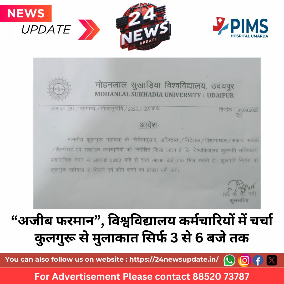 24 News update उदयपुर। सुविवि (मोहनलाल सुखाड़िया विश्वविद्यालय) प्रशासन ने कुलगुरू महोदया से मुलाकात को लेकर नया आदेश जारी किया है, जिसके बाद कर्मचारियों और संकाय सदस्यों में नाराजगी और चर्चा का माहौल है। नए आदेश के मुताबिक, अधिष्ठाता, निदेशक, विभागाध्यक्ष, संकाय सदस्य, शैक्षणिक और अशैक्षणिक कर्मचारी अब केवल दोपहर 3 बजे से शाम 6 बजे तक कुलपति सचिवालय, प्रशासनिक भवन में ही कुलगुरू महोदया से मिल सकेंगे।