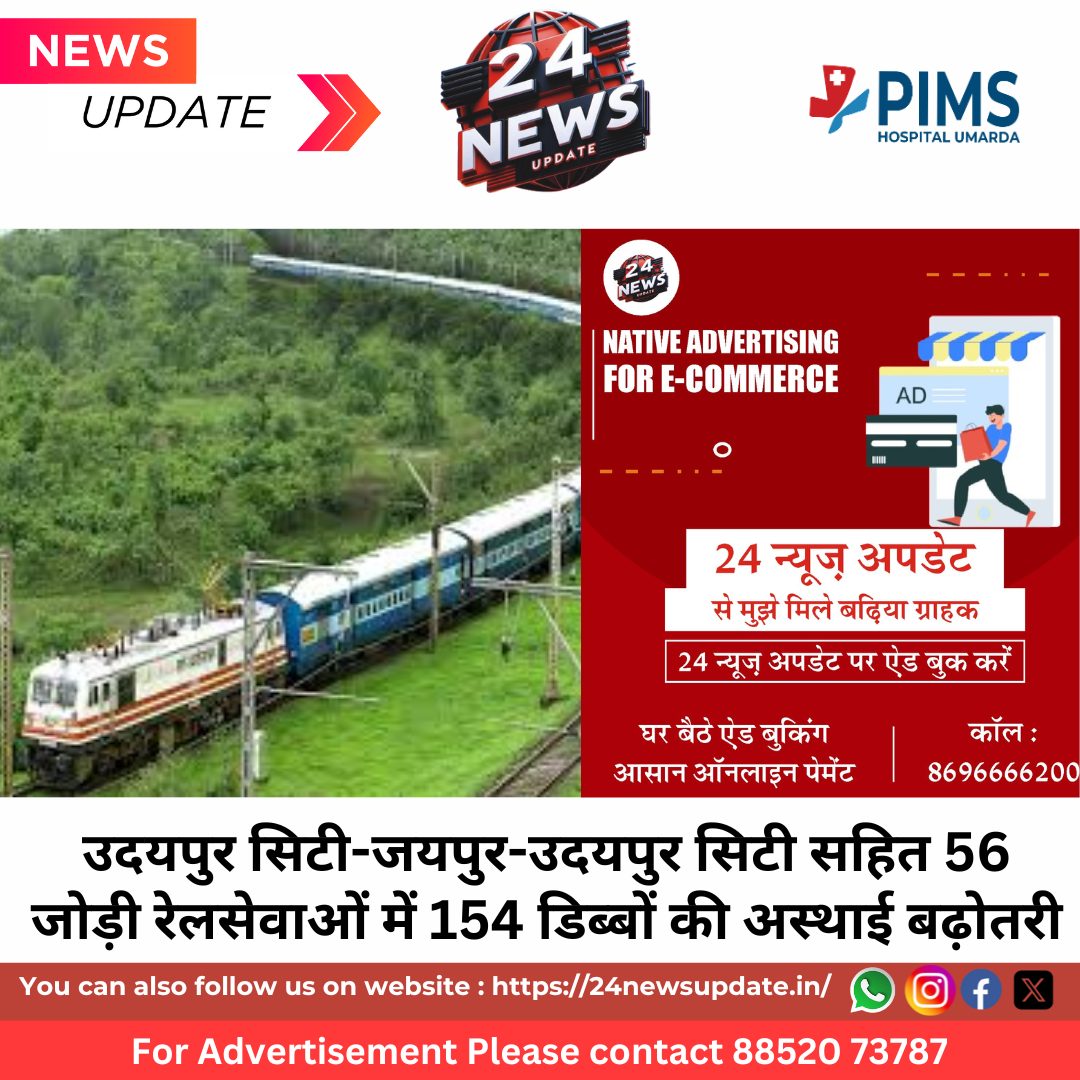 24 News Update जयपुर। यात्रियों की सुविधा और बढ़ते यातायात को ध्यान में रखते हुए उत्तर पश्चिम रेलवे ने 56 जोड़ी रेलसेवाओं में विभिन्न श्रेणियों के कुल 154 डिब्बों की अस्थाई बढ़ोतरी की है। यह निर्णय त्योहारों और यात्रा सीजन में यात्रियों को आरामदायक यात्रा सुविधा देने के उद्देश्य से लिया गया है।