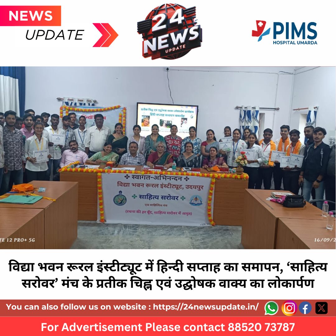 24 News Update उदयपुर। विद्या भवन रूरल इंस्टीट्यूट के हिन्दी विभाग द्वारा मंगलवार को हिन्दी सप्ताह का समापन समारोह एवं साहित्य सरोवर साहित्यिक मंच के प्रतीक चिह्न और उद्घोषक वाक्य का लोकार्पण कार्यक्रम आयोजित किया गया। हिन्दी विभागाध्यक्ष एवं मंच की परामर्शदाता डॉ. सरस्वती जोशी ने स्वागत उद्बोधन देते हुए मंच की स्थापना और उद्देश्यों पर प्रकाश डाला। कार्यक्रम की मुख्य वक्ता प्रो. गायत्री तिवारी (सेवानिवृत्त आचार्य, कृषि एवं प्रौद्योगिकी विश्वविद्यालय) ने कहा कि “हिन्दी भारत माँ के भाल की बिंदी है। हम सभी भाषाओं का सम्मान करते हैं, लेकिन उसकी कीमत पर अपनी माँ हिन्दी को नहीं भूल सकते। किसी भी देश की पहचान उसके साहित्य से होती है, इसलिए हिन्दी बोलने में हमें संकोच नहीं करना चाहिए।”