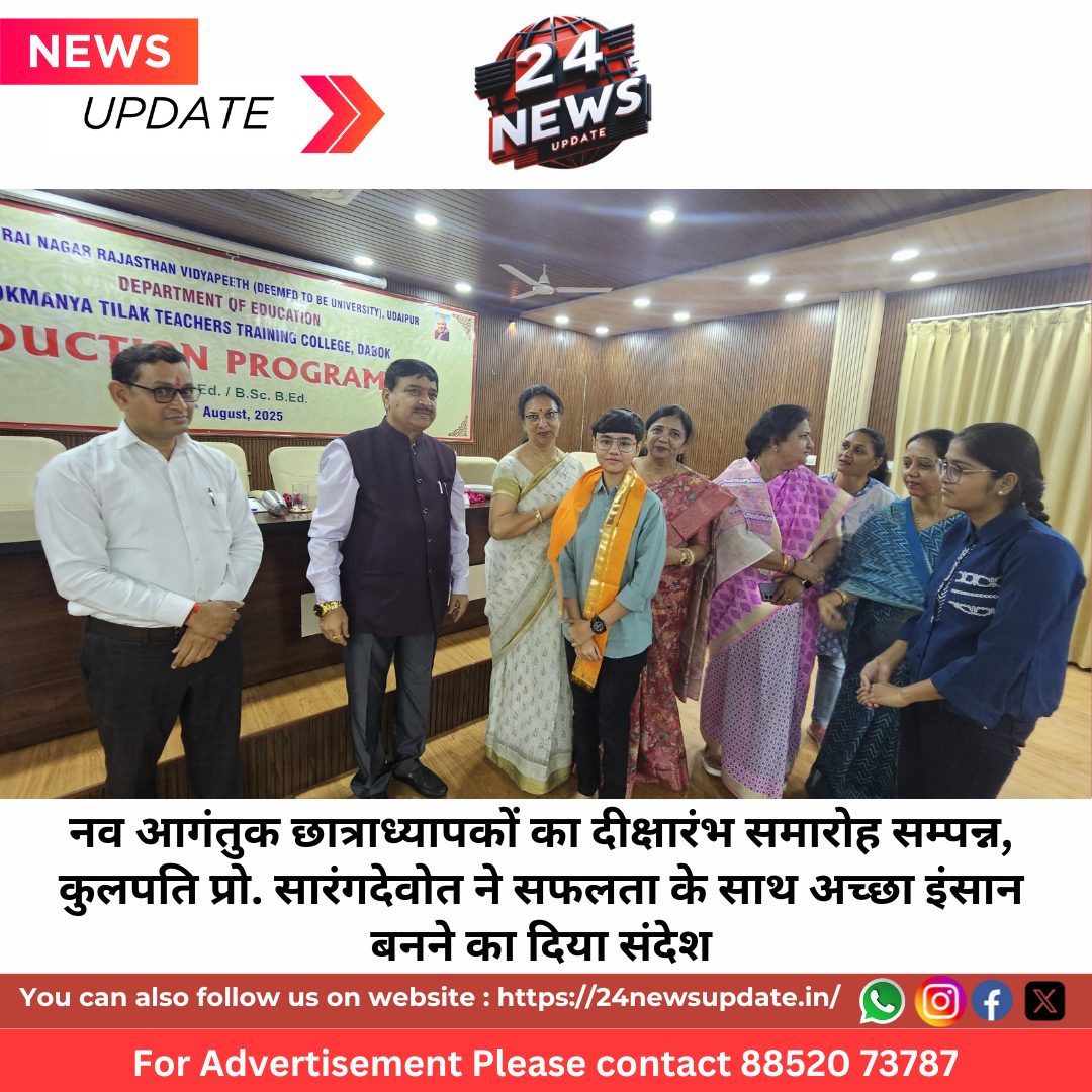 24 News Update उदयपुर । राजस्थान विद्यापीठ विश्वविद्यालय के संघटक लोकमान्य तिलक शिक्षक प्रशिक्षण महाविद्यालय में बी.ए.-बी.एड. और बी.एससी.-बी.एड. पाठ्यक्रमों के नव आगंतुक छात्राध्यापकों के लिए दीक्षारंभ समारोह सोमवार को महाविद्यालय सभागार में उत्साहपूर्वक आयोजित हुआ। कार्यक्रम का शुभारंभ कुलपति कर्नल प्रो. शिवसिंह सारंगदेवोत, प्रो. मुनेश चन्द्र त्रिवेदी, प्राचार्य प्रो. सरोज गर्ग, डॉ. अमी राठौड़, डॉ. बलिदान जैन और डॉ. रचना राठौड़ ने मां सरस्वती की प्रतिमा के समक्ष दीप प्रज्ज्वलित कर किया। अतिथियों ने नव प्रवेशित छात्राध्यापकों का उपरणा ओढ़ाकर सम्मान किया।