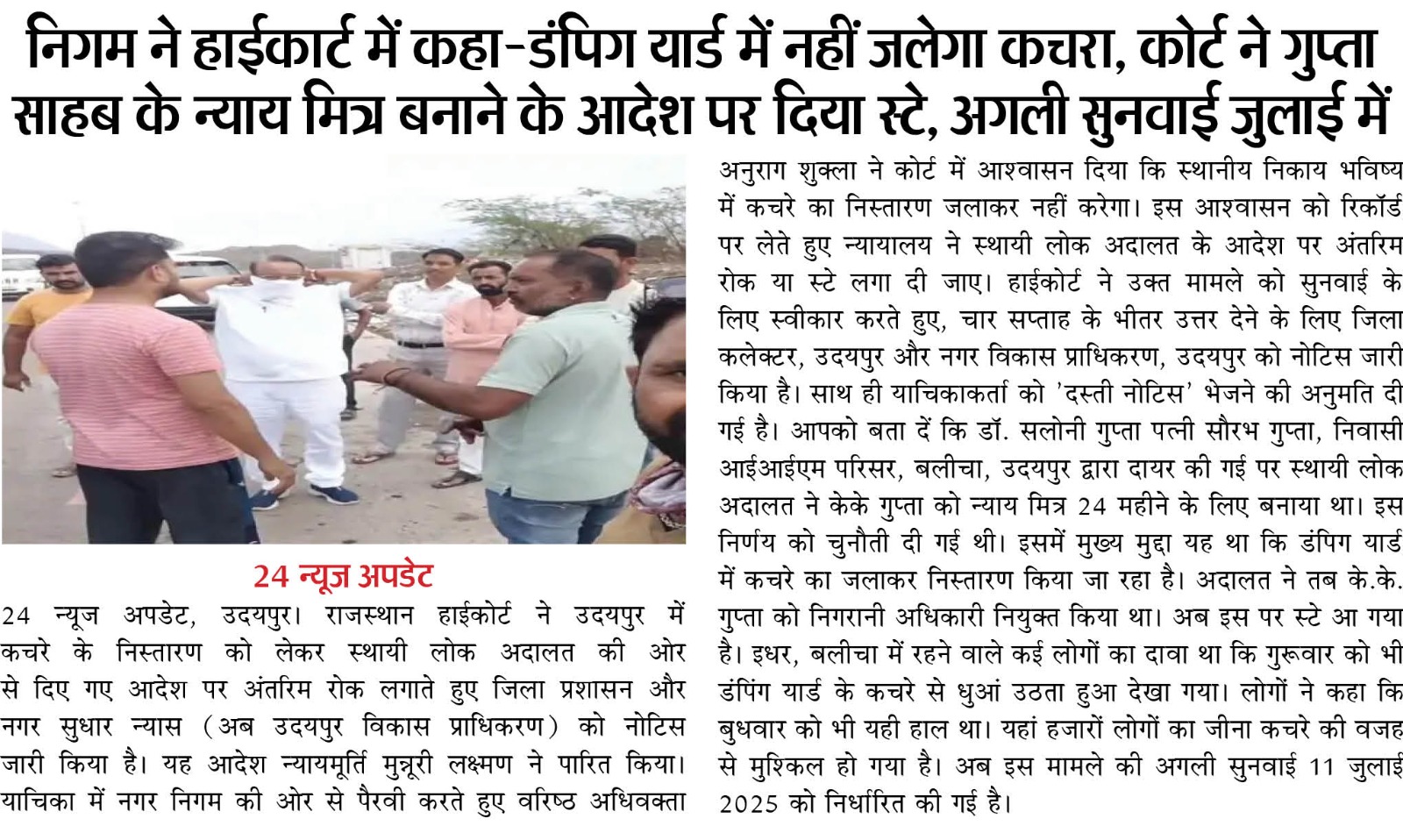 24 News Update उदयपुर. विकास प्राधिकरण) को नोटिस जारी किया है। यह आदेश न्यायमूर्ति मुन्नूरी लक्ष्मण ने पारित किया। याचिका में नगर निगम की ओर से पैरवी करते हुए वरिष्ठ अधिवक्ता अनुराग शुक्ला ने कोर्ट में आश्वासन दिया कि स्थानीय निकाय भविष्य में कचरे का निस्तारण जलाकर नहीं करेगा। इस आश्वासन को रिकॉर्ड पर लेते हुए न्यायालय ने स्थायी लोक अदालत के आदेश पर अंतरिम रोक या स्टे लगा दी जाए। हाईकोर्ट ने उक्त मामले को सुनवाई के लिए स्वीकार करते हुए, चार सप्ताह के भीतर उत्तर देने के लिए जिला कलेक्टर, उदयपुर और नगर विकास प्राधिकरण, उदयपुर को नोटिस जारी किया है। साथ ही याचिकाकर्ता को ’दस्ती नोटिस’ भेजने की अनुमति दी गई है। आपको बता दें कि डॉ. सलोनी गुप्ता पत्नी सौरभ गुप्ता, निवासी आईआईएम परिसर, बलीचा, उदयपुर द्वारा दायर की गई पर स्थायी लोक अदालत ने केके गुप्ता को न्याय मित्र 24 महीने के लिए बनाया था। इस निर्णय को चुनौती दी गई थी। इसमें मुख्य मुद्दा यह था कि डंपिग यार्ड में कचरे का जलाकर निस्तारण किया जा रहा है। अदालत ने तब के.के. गुप्ता को निगरानी अधिकारी नियुक्त किया था। अब इस पर स्टे आ गया है। इधर, बलीचा में रहने वाले कई लोगों का दावा था कि गुरूवार को भी डंपिंग यार्ड के कचरे से धुआं उठता हुआ देखा गया। लोगों ने कहा कि बुधवार को भी यही हाल था। यहां हजारों लोगों का जीना कचरे की वजह से मुश्किल हो गया है। अब इस मामले की अगली सुनवाई 11 जुलाई 2025 को निर्धारित की गई है।