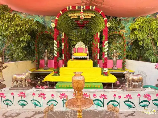 सांयकालीन सेवा में प्रभु को रजत सिंहासन पर विराजमान कर फूलपत्तियों से सजाया गया। वातावरण में छिड़काव हेतु ऊपर और नीचे दोनों ओर से फव्वारों की विशेष व्यवस्था की गई थी, जिससे सावन-भादों की सुहावनी वर्षा का सजीव अनुभव हुआ। भक्तों ने इस अनुपम दृश्य के बीच भीगते हुए प्रभु के दर्शन कर भावविभोर हो गए।