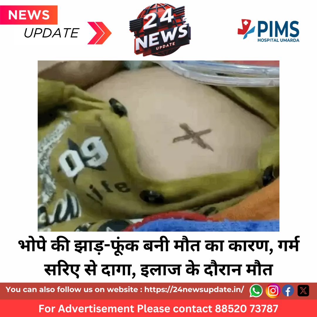 24 News Update भीलवाड़ा। भीलवाड़ा जिले के सदर थाना क्षेत्र के इंद्रास गांव में अंधविश्वास के चलते एक मासूम की जान चली गई। परिजनों ने सर्दी-जुकाम और सांस लेने में तकलीफ से पीड़ित 9 महीने के बच्चे को अस्पताल ले जाने के बजाय एक भोपा (झाड़-फूंक करने वाला) के पास पहुंचाया। वहां भोपे ने इलाज के नाम पर बच्चे को गर्म सरिए से पेट पर दाग दिया, जिससे उसकी हालत और बिगड़ गई।