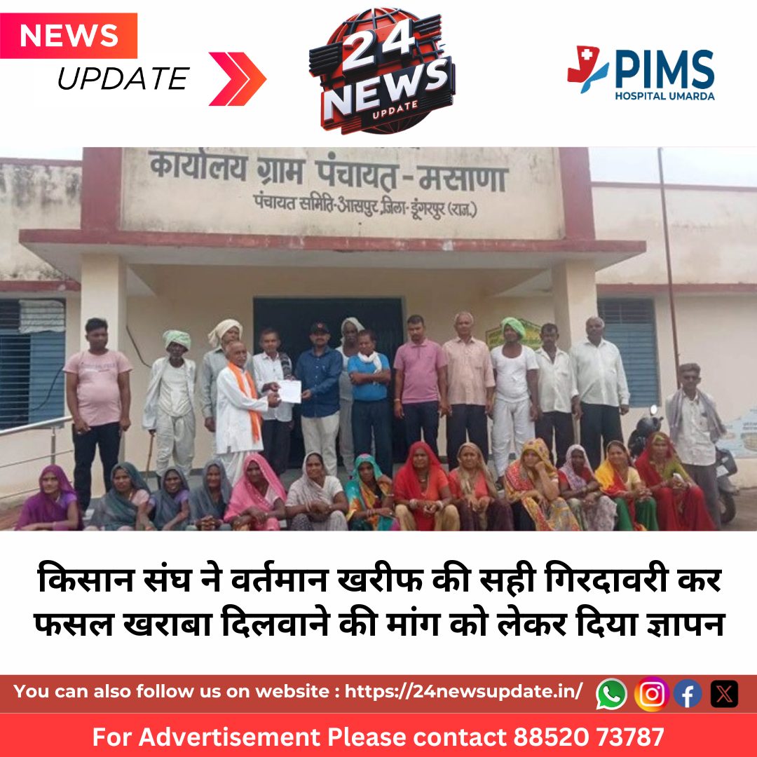संघ के जिला प्रवक्ता लल्लुराम बिजोला ने बताया की भारतीय किसान संघ राजस्थान प्रदेश के आह्वान पर मंगलवार को भारतीय किसान संघ जिला डूंगरपुर की ओर से जिले की सभी तहसीलों के प्रत्येक ग्राम पंचायत पर किसान संघ के पदाधिकारियों द्वारा पंचायत सचिव या पटवारी को प्रधानमंत्री नरेन्द्र मोदी, केंद्रीय कृषि मंत्री एवं राजस्थान सरकार के मुख्यमंत्री के नाम किसानों को वर्तमान खरीफ फसल की सही गिरदावरी कर फसल खराबा दिलवाने,फसल बीमा योजना के नियमों में बदलाव करने, बिजली, सिंचाई , खाद, दूध डेरी,कृषि मंडी की समस्या का समाधान करने , कृषि यंत्रों पर टैक्स हटाने, चारागाह भूमि संरक्षण हेतु ज्ञापन सौंप कर मांग की गई है कि किसानों की इन समस्याओं का जल्द समाधान करने की मांग की गई। संघ द्वारा 4 सितंबर को जिले की सभी तहसील मुख्यालयों पर उपखंड अधिकारी व तहसीलदार को एवं 8 सितम्बर को जिला मुख्यालय पर सैकड़ों किसान व पदाधिकारियों की ओर से धरना प्रदर्शन कर जिला कलेक्टर को प्रधानमंत्री, मुख्यमंत्री व केंद्रीय कृषि के नाम ज्ञापन दिया जायेगा।