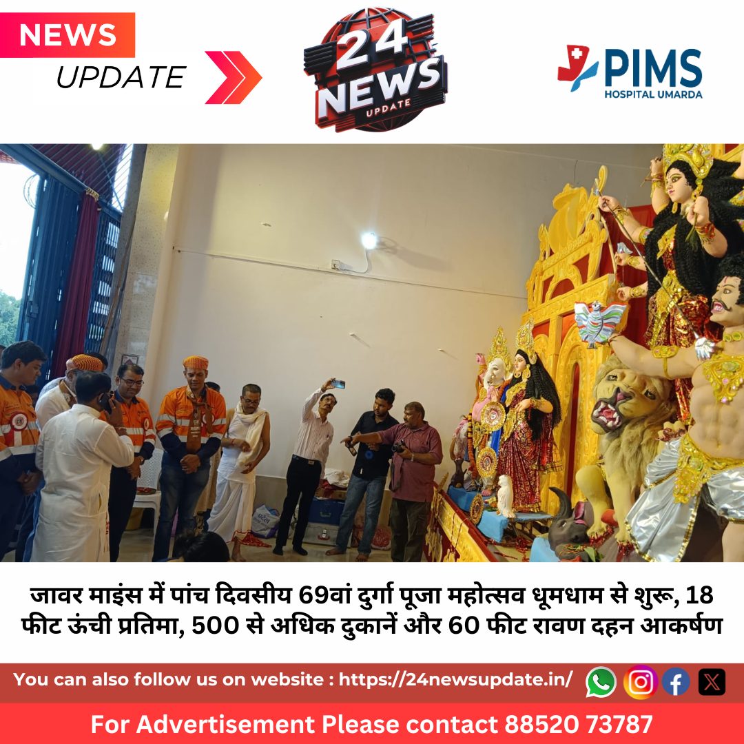 24 News Udpate सलूंबर। शारदीय नवरात्र के अवसर पर जावर माइंस स्टेडियम में शुक्रवार को महा सप्तमी के दिन पांच दिवसीय 69वां दुर्गा पूजा महोत्सव विधिवत उद्घाटन के साथ शुरू हुआ। आयोजन स्थल पर श्रद्धालुओं और मेले में आने वाले लोगों की भीड़ ने उत्साह और श्रद्धा का अनोखा संगम प्रस्तुत किया।