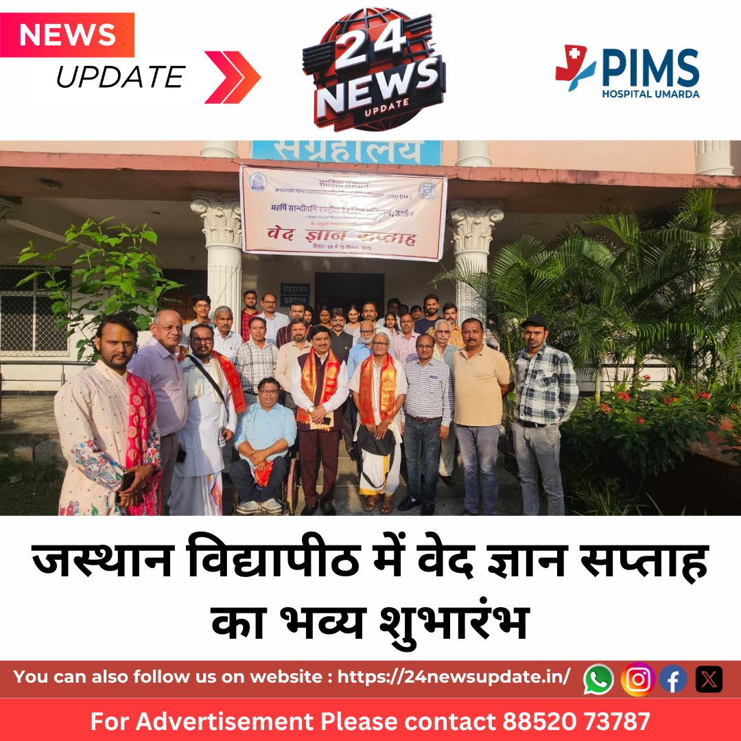 24 News Update उदयपुर, राजस्थान विद्यापीठ के संघटक साहित्य संस्थान एवं महर्षि सांदीपनि राष्ट्रीय वेद विद्या प्रतिष्ठान, उज्जैन के संयुक्त तत्वावधान में सात दिवसीय वेद ज्ञान सप्ताह का भव्य उद्घाटन संपन्न हुआ। कार्यक्रम का आयोजन संस्थान के सभागार में किया गया, जिसमें कुलपति प्रो. एस.एस. सारंगदेवोत, मुख्य वक्ता डॉ. पंकज कुमार शर्मा, डॉ. सुरेन्द्र द्विवेदी, निदेशक प्रो. जीवन सिंह खरकवाल, प्रभारी डॉ. महेश आमेटा एवं संयोजक डॉ. कुलशेखर व्यास प्रमुख रूप से उपस्थित रहे।