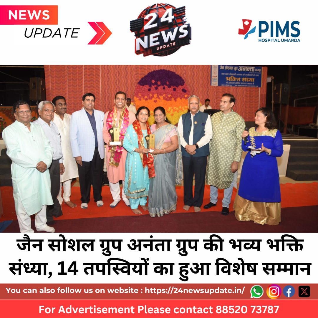 24 News Update उदयपुर। जैन सोशल ग्रुप (जेएसजी) अनंता द्वारा आयोजित भक्ति संध्या ने शहर में श्रद्धालुओं को आध्यात्मिक आनंद से भर दिया। जीरा वाला पार्श्वनाथ मंदिर, नवरत्न में रविवार को सम्पन्न इस कार्यक्रम में विशेष रूप से पर्युषण पर्व के बाद तपस्वियों के योगदान को याद किया गया और 14 तपस्वियों का सम्मान किया गया।