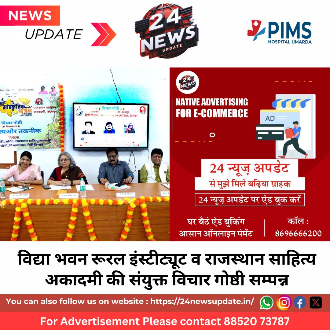 उदयपुर, 24 सितम्बर। राजस्थान साहित्य अकादमी, उदयपुर और विद्या भवन रूरल इंस्टीट्यूट के हिंदी विभाग के संयुक्त तत्वावधान में “साहित्य एवं तकनीक” विषय पर विचार गोष्ठी का आयोजन किया गया। यह कार्यक्रम राजस्थान सरकार के कला, साहित्य, संस्कृति एवं पुरातत्व विभाग के सांस्कृतिक सृजन पखवाड़ा के अंतर्गत आयोजित हुआ।