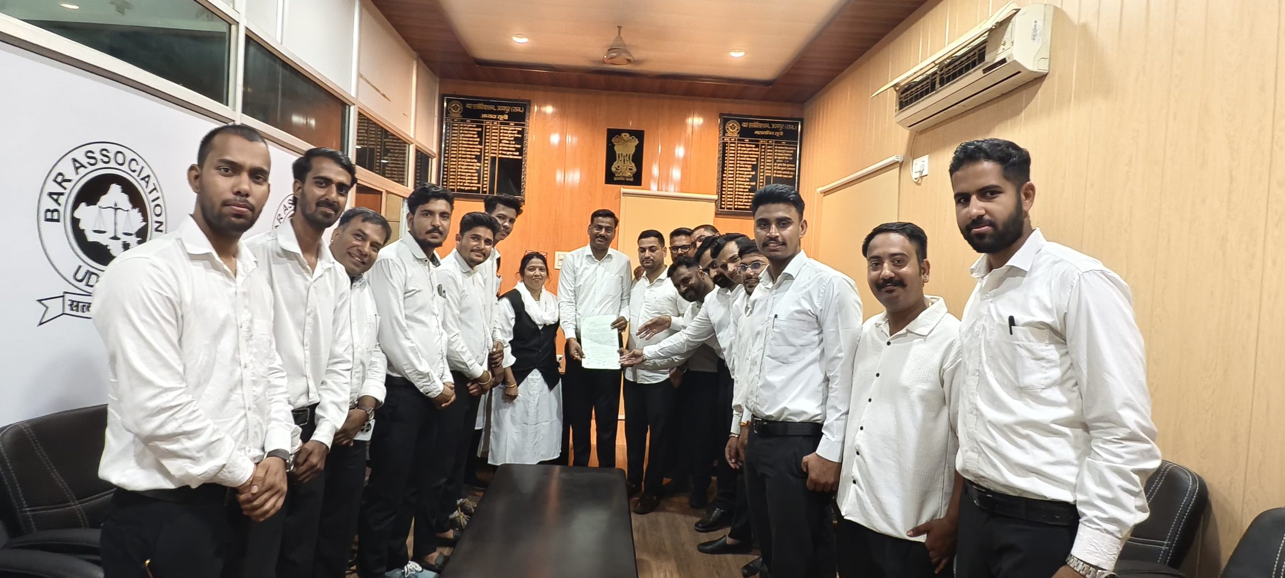 24 News Update Udaipur. सोमवार को न्यायालय परिसर मे इन्टरशीप करने हेतु आने वाले लॉ कॉलेज के विद्यार्थीयों को न्यायालय परिसर मे अपने ड्रेस कोड मे नीले कलर का शर्ट पहन कर व अपने गले मे कॉलेज का आईडी कार्ड लगा कर रखे साथ ही सनद् नही आने तक अपने वाहन एवं सोश्यल आईडी पर अपने नाम के साथ एडवोकेट शब्द व लॉगो का उपयोग न करने का आदेश जारी किया था जिसपर इन्टरशीप कर रहे लॉ कॉलेज के विद्यार्थीयों ने अध्यक्ष चन्द्रभान सिंह शक्तावत से मुलाकात कर कहा कि उन्हे उक्त आदेश मे रियायत की मांग की कि शर्ट का कलर नीले से सफेद किया जावे क्योकी कॉलेज मे सफेद शर्ट का ही चलन है बाकी समस्त विद्यार्थी अपना आईडी कार्ड साथ रखेगे व सनद् नही आने तक अधिवक्ता (एडवोकट) शब्द का उपयोग नही करेगे।