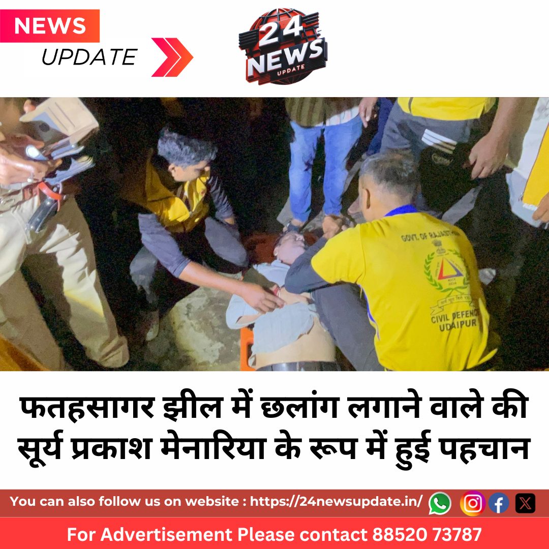 24 News Update उदयपुर . उदयपुर की फतहसागर झील की पाल पर एक 45 वर्षीय व्यक्ति ने अपनी बाइक और मोबाइल किनारे रखकर झील में छलांग लगा दी। घटना की सूचना मिलते ही राजस्थान नागरिक सुरक्षा विभाग की टीम मौके पर पहुंची और करीब एक घंटे की मशक्कत के बाद शव को झील से बाहर निकाला गया तथा अंबामाता थाना पुलिस को सुपुर्द किया गया। बचाव दल में वाहन चालक मोहन सिंह राणावत, गोताखोर हितेश सोलंकी, विक्रम सिंह सरदार, धर्मेंद्र यादव, विनोद डांगी, मनीष सेन, कपिल सालवी, मनोज जी सी, प्रवीण सिंह राठौड़, भवानी शंकर वाल्मीकि और बोट ऑपरेटर कैलाश मेनारिया शामिल रहे। मृतक की पहचान सूर्य प्रकाश मेनारिया पुत्र उदय लाल मेनारिया निवासी पानेरियों की मादड़ी, उदयपुर के रूप में हुई है। फिलहाल आत्महत्या के कारणों का पता नहीं चल पाया है, पुलिस ने मामला दर्ज कर जांच शुरू कर दी है।
