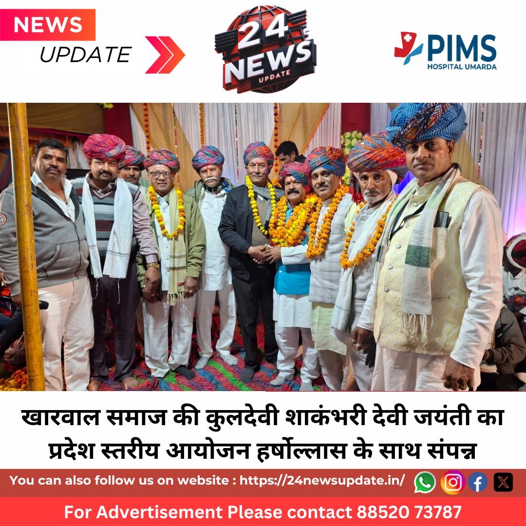 24 News Update . खारवाल खारोल समाज की कुलदेवी मां शाकंभरी देवी का प्राकट्य दिवस 3 जनवरी शनिवार को प्रदेश के सभी अंचलों में बड़े हर्षोल्लास के साथ मनाया गया। प्रदेश स्तरीय कार्यक्रम का आयोजन भीलवाड़ा जिले के चांदरास शाकंभरी मंदिर पर संपन्न हुआ। इस अवसर पर कोटा से समाज के संभागीय अध्यक्ष-सत्यनारायण खारवाल, युवा संगठन जिला अध्यक्ष- निर्मल खारोल, संगठन मंत्री – बालचंद खारवाल, महिला संगठन जिला अध्यक्ष- सुनीता खारोल आदि कोटा संभाग समिति पदाधिकारियों ने इस आयोजन में भाग लिया। चांदरास मंदिर समिति के अध्यक्ष – मांगीलाल खारोल करेड़ा ने बताया कि इस राज्य स्तरीय कार्यक्रम के मुख्य अतिथि मांडल विधायक- उदयलाल भड़ाणा रहे एवं कार्यक्रम की अध्यक्षता खारोल खारवाल समाज महासभा के राष्ट्रीय अध्यक्ष- सुरेश जी खारवाल घाटाबिल्लौद इंदौर ने की।विशिष्ट अतिथियों में बाबूलाल भडाणा, वरिष्ठ भाजपा नेता, मणिराज सिंह लुहारिया, गुजरात प्रदेश अध्यक्ष- बद्रीलाल खारोल, संरक्षक- गिरधारी लाल पंवार, प्रदेश सचिव- बाबूलाल माछलीया अहमदाबाद, कोटा संभाग अध्यक्ष- सत्यनारायण खारवाल कोटा, युवा संगठन जिला अध्यक्ष- निर्मल खारोल, संगठन मंत्री-बालचंद खारवाल कोटा, शाकंभरी युवा शक्ति प्रदेश अध्यक्ष – नंदकिशोर खारोल ताजपुरा, सचिव- ओमप्रकाश दतवाल रघुनाथ पुरा, राष्ट्रीय उपाध्यक्ष- जगदीश खारोल सरसी, राष्ट्रीय कोषाध्यक्ष- कुशाल सिंह डोडिया, चांदरास सरपंच प्रतिनिधि नारायण लाल गुर्जर रहे। कार्यक्रम का संचालन शिवलाल खारोल पुर भीलवाड़ा वालो ने किया। रात्रि में विशाल भजन संध्या और अतिथियों के सम्मान के साथ-साथ परंपरागत सांस्कृतिक कार्यक्रमों का आयोजन हुआ।समाज की आस्था के केंद्र चांदरास शाकंभरी मंदिर पर मेवाड़ अंचल से समाज के 60 गांवों से सजी-धजी शोभा यात्रा झांकियां ढोल नगाड़ों के साथ जयकारे लगाते हुए हजारों की संख्या में मातृशक्ति और युवा साथी अपने परिजनों के साथ माता के दरबार में पहुंचकर अपनी कुलदेवी के दर्शन कर आशीर्वाद प्राप्त किया।