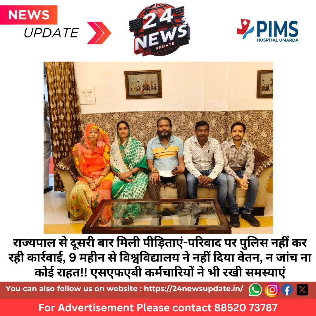 24 न्यूज अपडेट, उदयपुर। पुलिस में परिवाद दिए महीनों बीत गए, ना तो कोई सुनवाई हुई, ना किसी का फोन आया। ना हमको बुलाया ना ही कोई राहत दी। विश्वविद्यालय में भी पीड़ा बताई लेकिन 9 महीने से वेतन को तरस रहे हैं। अवकाश प्राप्त वीसी प्रोफेसर सुनीता मिश्रा ने प्रताड़ित किया, अभद्र भाषा का प्रयोग किया, हमने शिकायत की मगर कहीं कोई सुनने तक को तैयार नहीं है। यहां तक कि राज्यपाल महोदय आपश्री को ज्ञापन देने के बाद भी अब तक कोई कार्रवाई नहीं हुई है। इसके साथ ही एसएफएबी के कर्मचारियों को हर महीने वेतन के लिए तरसाया जा रहा है। जान बूझकर ऐसी हड़ताल की नौबत लाई जा रही है। आखिर यह सब कब तक चलेगा। हमें न्याय कब मिलेगा। यह पीड़ा आज राजस्थान के राज्यपाल हरिभाउ किसनराव बागड़े के समक्ष मोहनलाल सुखाड़िया विश्वविद्यालय की एसएफएबी महिला कर्मचारियों व प्रतिनिधिमंडल ने व्यक्त की।