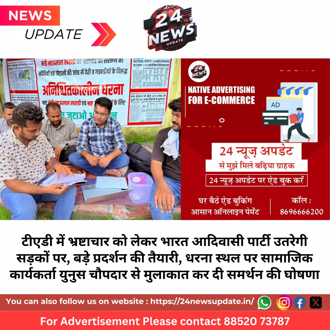 जिलाध्यक्ष अमित ने जानकारी दी कि टीएडी में व्याप्त भ्रष्टाचार को लेकर भारत आदिवासी पार्टी जल्द ही टीएडी आयुक्त कार्यालय के बाहर बड़ा विरोध प्रदर्शन करने जा रही है। उन्होंने बताया कि “अगामी 1-2 दिनों में प्रदर्शन की तारीख की घोषणा कर दी जाएगी, और पार्टी इस आंदोलन को जन-जन तक पहुंचाएगी।” सामाजिक कार्यकर्ता युनुस चौपदार द्वारा बीते एक माह से जनजाति आयुक्त कार्यालय के बाहर दिए जा रहे अनिश्चितकालीन धरने को अब धीरे-धीरे सामाजिक संगठनों, छात्रों और राजनीतिक दलों का समर्थन मिलने लगा है। चौपदार का कहना है कि जब तक घोटालेबाज अधिकारियों और नेताओं पर कार्रवाई नहीं होती, वे धरना समाप्त नहीं करेंगे।