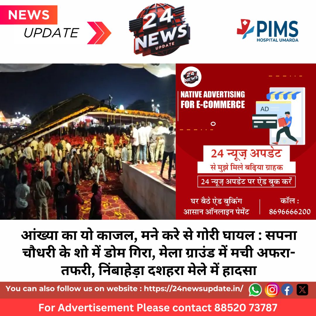 24 news Update निंबाहेड़ा। राष्ट्रीय दशहरा मेले में सोमवार देर रात बड़ा हादसा होते-होते टल गया। हरियाणवी डांसर सपना चौधरी की परफॉर्मेंस के दौरान दर्शकों से भरा डोम अचानक ध्वस्त हो गया। हजारों लोग वहां मौजूद थे, जिससे कुछ समय के लिए अफरा-तफरी मच गई। हालांकि, गनीमत रही कि हादसे में कोई घायल नहीं हुआ।