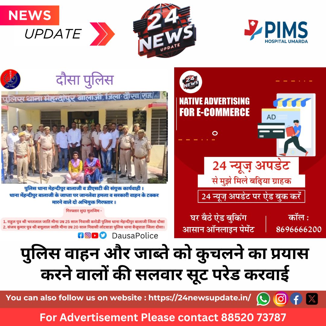 24 News Update दौसा। दौसा जिले के मेहंदीपुर थाना क्षेत्र में पुलिस ने जयपुर से दो आरोपियों को गिरफ्तार किया है जिनपर पुलिस के वाहन व जाब्ते को टक्कर मारने व उसे कुचलने का प्रयास करने का आरोप है। मामला 3 अक्टूबर की रात को NH‑21 पर शुरू हुए विवाद से जुड़ा है।प्राथमिक जानकारी के अनुसार, खेड़ा पहाड़पुर गांव के पास तीन लोगों का एक होटल संचालक से झगड़ा हुआ। मौके पर पहुंची पुलिस का सामना होने पर तीनों फरार हो गए। आरोपियों ने बाद में लौटकर पुलिस के जाब्ते और वाहन को टक्कर मारने का प्रयास किया और वाहन लेकर फरार हो गए।जांच के दौरान रविवार को जयपुर के एक इलाके से राहुल मीणा और संजय मीणा को गिरफ्तार किया गया। तीसरे आरोपी दिलखुश उर्फ़ डीके की तलाश जारी है। गिरफ्तार आरोपियों के पास से महिलाओं के कपड़े मिले जो उन्होंने छुपने के लिए पहने थे, पुलिस ने बताया।गिरफ्तारी के बाद दोनों आरोपियों को मेहंदीपुर लाकर घटनास्थल पर पेश किया गया, जहां उन्हें स्थानीय पुलिस ने सार्वजनिक रूप से दिखाया। मौके पर मौजूद लोग और पुलिस ने घटना की निंदा की। आरोपियों ने मौके पर हाथ जोड़कर माफी मांगी और आगे से ऐसी हरकत न करने की चेतावनी भी दी।मेहंदीपुर थाना पुलिस ने मामला दर्ज कर आगे की कार्रवाई शुरू कर दी है तथा प्राथमिकी में संबंधित धाराएँ लगाई गई हैं। मामले की विस्तृत जांच और दूसरा आरोपी पकड़े जाने का दावा पुलिस कर रही है। Share this: Share on X (Opens in new window) X Share on Facebook (Opens in new window) Facebook More Email a link to a friend (Opens in new window) Email Share on WhatsApp (Opens in new window) WhatsApp Like this:Like Loading... Related Discover more from 24 News Update Subscribe to get the latest posts sent to your email. Type your email… Subscribe Post navigation कफ सिरप विवाद: प्रेस कॉन्फ्रेंस छोड़कर चले गए चिकित्सा मंत्री गजेंद्र सिंह खींवसर कीचड़ में खिला-लातों घूसों का कमल, “ज्ञापन बाउंसर सेवा प्रा. लि.” वाले स्टार्टप की जरूरत