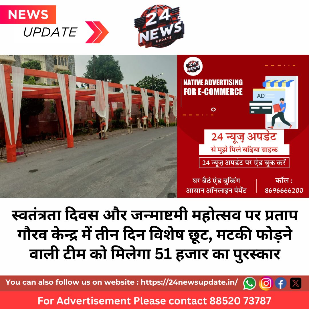 24 News Update उदयपुर. प्रताप गौरव केन्द्र ‘राष्ट्रीय तीर्थ’ में इस वर्ष स्वतंत्रता दिवस के साथ ही जन्माष्टमी महोत्सव का शुभारंभ होगा। 15 से 17 अगस्त तक चलने वाले तीन दिवसीय महोत्सव और मेले के दौरान प्रताप गौरव केन्द्र दर्शन के शुल्क में विशेष छूट दी जाएगी।