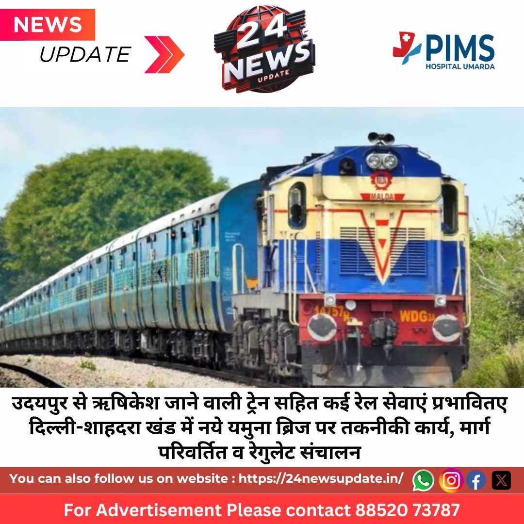 24 न्यूज अपडेट, जयपुर। दिल्ली मंडल के दिल्ली–दिल्ली शाहदरा रेल खंड के मध्य स्थित ब्रिज नंबर 249 के स्थान पर नये यमुना ब्रिज पर तकनीकी कार्य किया जा रहा है। इस कार्य हेतु ब्लॉक लिया गया है। परिणामस्वरूप, उत्तर पश्चिम रेलवे पर संचालित कुछ रेल सेवाएं मार्ग परिवर्तित अथवा रेगुलेट रहेंगी।