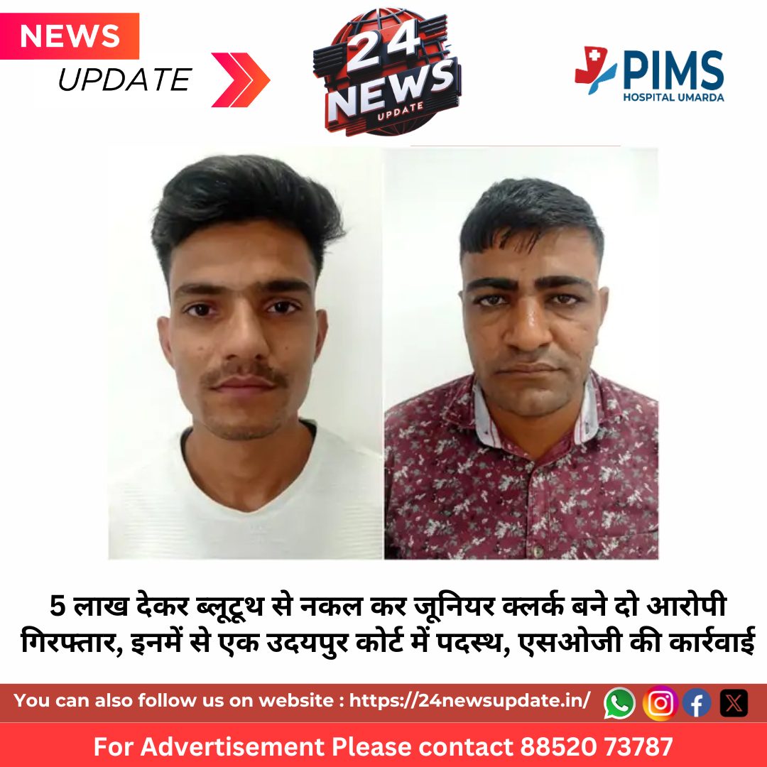 24 News Update उदयपुर। स्पेशल ऑपरेशन ग्रुप (एसओजी) ने जूनियर क्लर्क बनने वाले दो आरोपियों को शुक्रवार दोपहर गिरफ्तार किया है। ये दोनों आरोपी राजस्थान हाईकोर्ट की कनिष्ठ न्यायिक सहायक लिपिक ग्रेड सेकेंड और लिपिक ग्रेड सेकेंड के पदों पर सीधी भर्ती के लिए आयोजित संयुक्त प्रतियोगी परीक्षा-2022 में ब्लूटूथ डिवाइस से नकल कर पास हुए थे।