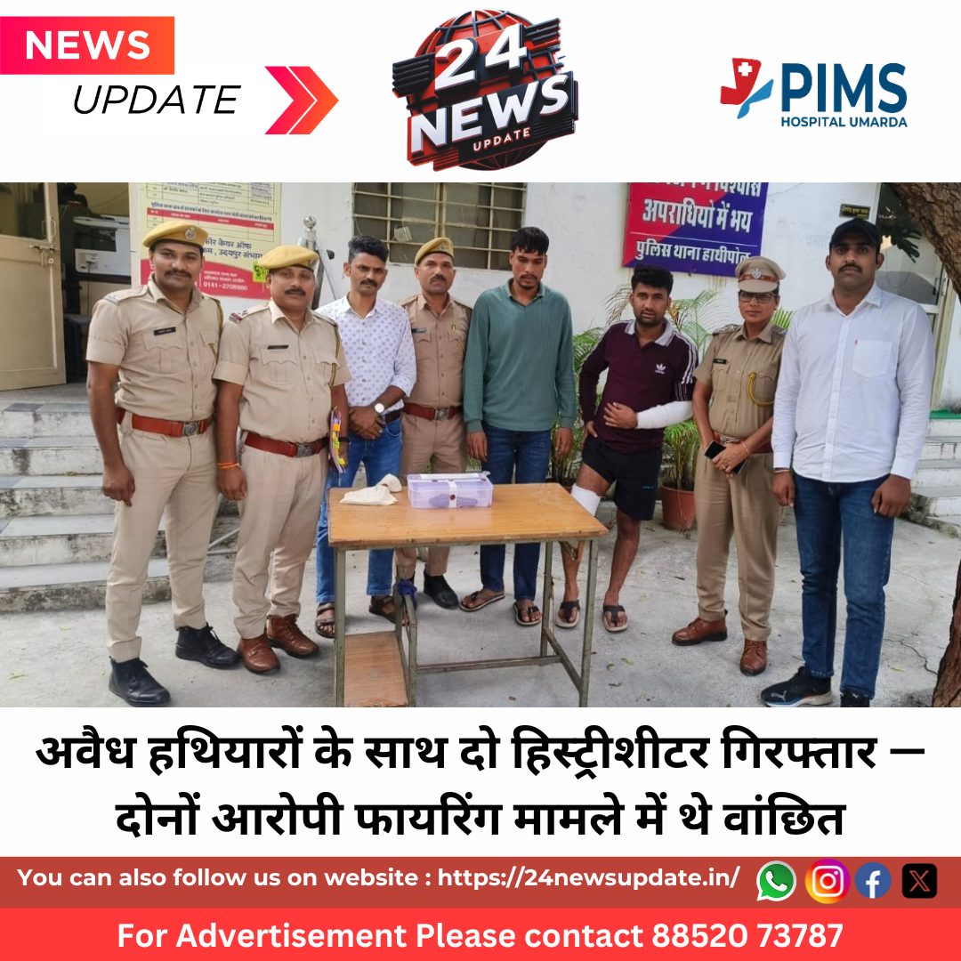 24 News Update उदयपुर। जिला पुलिस अधीक्षक उदयपुर श्री योगेश गोयल के निर्देशन में चल रहे अवैध मादक पदार्थ व हथियारों की धरपकड़ अभियान के तहत थाना हाथीपोल पुलिस और जिला स्पेशल टीम ने संयुक्त कार्रवाई करते हुए दो कुख्यात हिस्ट्रीशीटर अपराधियों को गिरफ्तार किया है। थानाधिकारी श्री राजूदेवी राज के नेतृत्व में की गई इस कार्रवाई में पुलिस ने शोएब उर्फ पहलवान और सोहेल उर्फ अन्ना को गिरफ्तार किया। दोनों आरोपी अवैध पिस्टल, दो कारतूस और धारदार चाकू लेकर शहर में किसी बड़ी वारदात को अंजाम देने की फिराक में घूम रहे थे। दोनों आरोपी पहले से थाना हाथीपोल सर्कल में हुई फायरिंग की घटना में वांछित चल रहे थे। प्रारंभिक पूछताछ में आरोपियों ने बताया कि उनका झगड़ा राहिल उर्फ बोहरा का मलिक उर्फ भों (निवासी महावतवाड़ी) से हुआ था, और उसी रंजिश में उन्होंने हथियार अपने पास रखे थे। पुलिस आरोपियों से यह भी पूछताछ कर रही है कि हथियार कहां से और कैसे खरीदे गए। दोनों आरोपी शातिर एवं आदतन अपराधी हैं तथा इनके विरुद्ध उदयपुर शहर के विभिन्न थानों में हत्या के प्रयास, लूट, मारपीट व आर्म्स एक्ट के तहत दर्जनों मुकदमे दर्ज हैं।