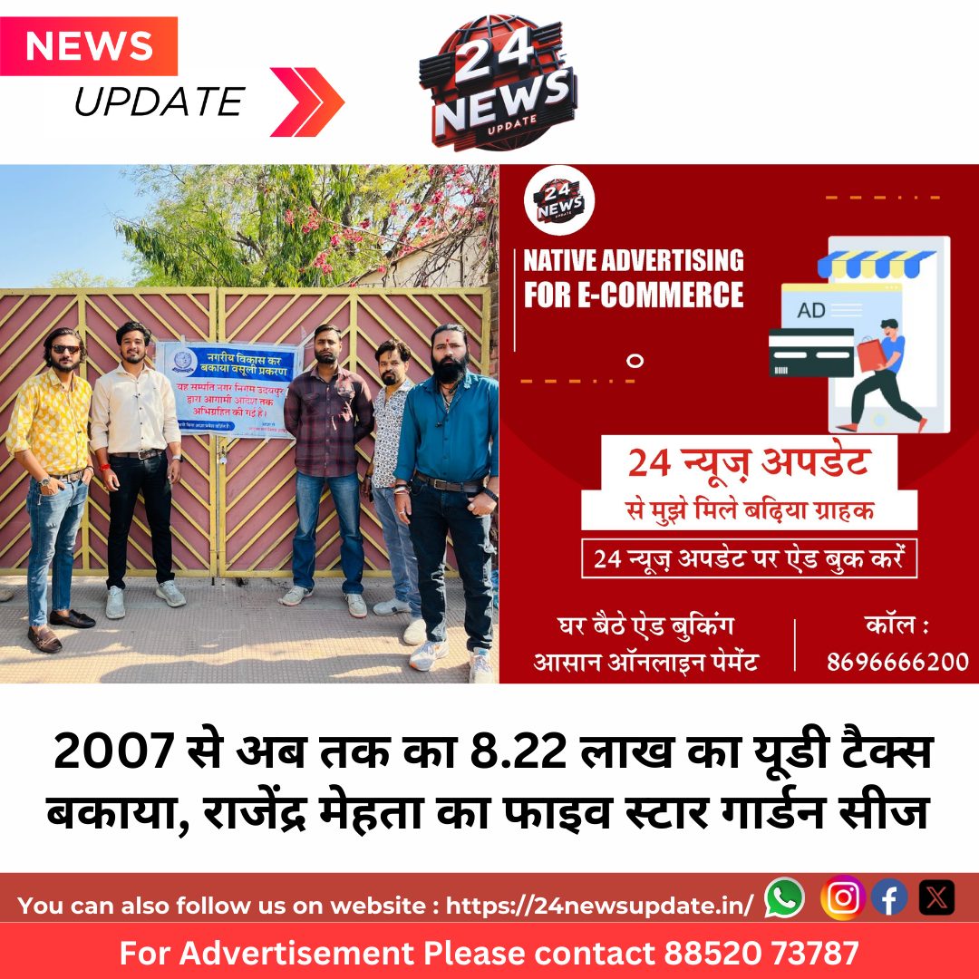 24 न्यूज अपडेट, उदयपुर। उदयपुर के ठोकर चौराहे पर स्थित स्थित फाइव स्टार गार्डन को आज नगर निगम के दस्ते ने सीज कर दिया। बकाया नगरीय विकास कर (यूडी टैक्स) जमा नहीं होने की वजह से सीज की कार्रवाई हुई है। नोटिस में बताया गया है कि 8.22 लाख रुपये का टैक्स बकाया है।