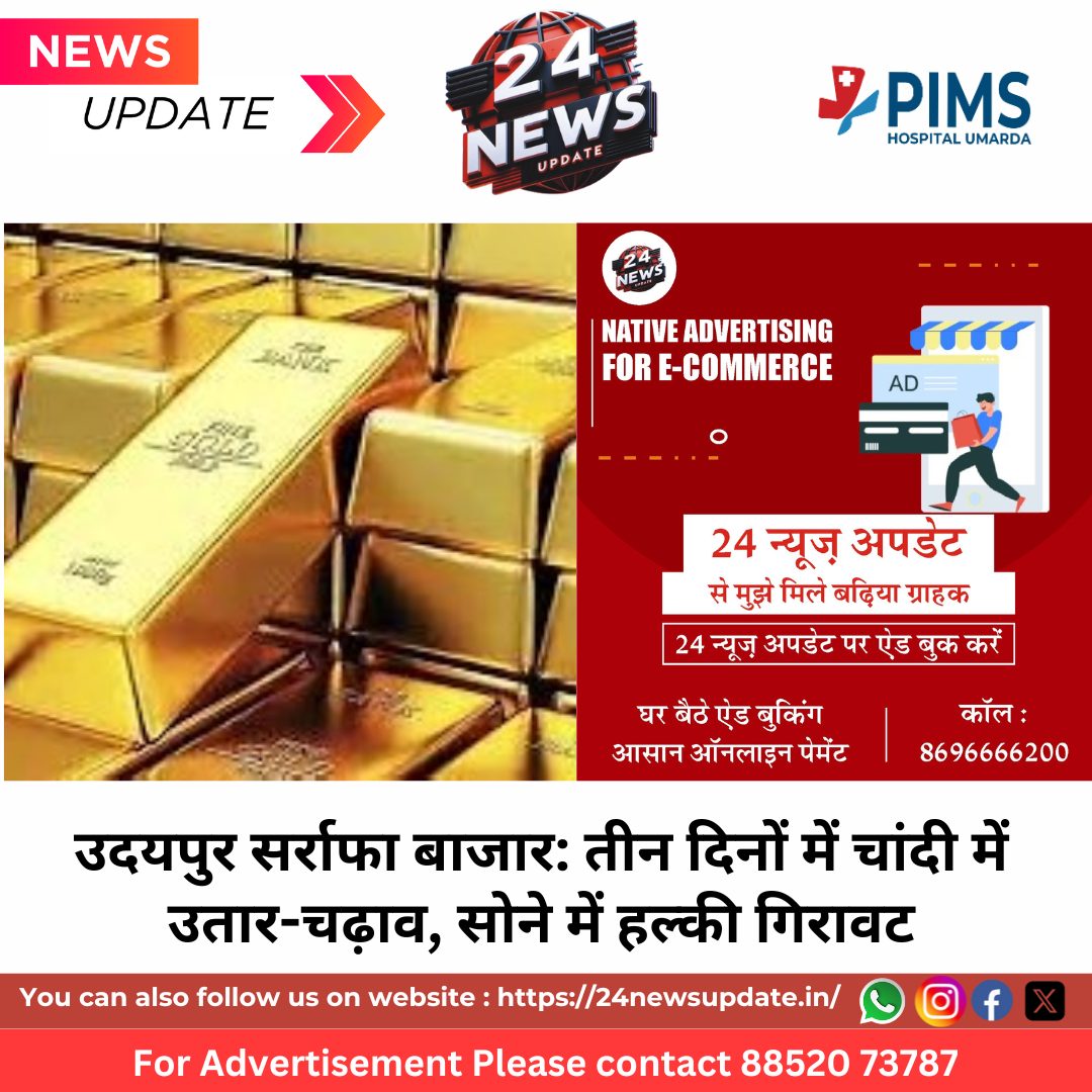 24 News Update उदयपुर। सर्राफा एसोसिएशन के अनुसार बीते तीन दिनों में चांदी और सोने के भावों में उतार-चढ़ाव दर्ज किया गया। 15 सितम्बर को जहां चांदी टंच 1,30,900 रुपये प्रति किलोग्राम और सोना स्टैंडर्ड (999) 1,13,200 रुपये प्रति 10 ग्राम रहा, वहीं 16 सितम्बर को चांदी और सोने दोनों के दामों में बढ़ोतरी दर्ज की गई। उस दिन चांदी टंच 1,32,900 रुपये और सोना स्टैंडर्ड 1,14,200 रुपये तक पहुंच गया। हालांकि 17 सितम्बर को बाजार में फिर गिरावट देखने को मिली। चांदी टंच 1,29,700 रुपये और सोना स्टैंडर्ड 1,13,300 रुपये पर आ गया। इसी तरह सोना जेवराती (23 कैरेट) 1,08,770 रुपये तथा सोना (22 कैरेट) 1,04,235 रुपये प्रति 10 ग्राम दर्ज हुआ। सर्राफा व्यापारियों के अनुसार अंतरराष्ट्रीय बाजार में उतार-चढ़ाव का सीधा असर स्थानीय बाजार पर देखने को मिल रहा है। विशेषज्ञों का मानना है कि त्योहारी सीजन नजदीक आने के चलते आने वाले दिनों में सोने-चांदी के भावों में और हलचल देखी जा सकती है।