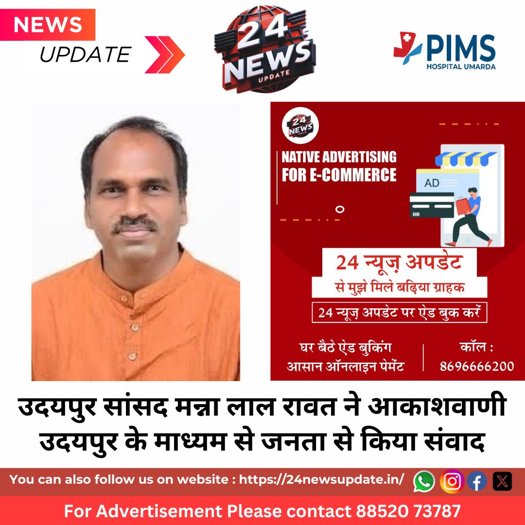 24 News Udpate उदयपुर। आज दिनांक 23 अक्टूबर 2025 को आकाशवाणी उदयपुर से संसदीय क्षेत्र उदयपुर के सांसद डॉ. मन्ना लाल रावत ने लाइव कार्यक्रम के माध्यम से जनता के साथ सीधा संवाद किया। मीडिया प्रभारी डॉ सीमा चंपावत में बताया कि इस अवसर पर उन्होंने आमजन से जुड़ी विभिन्न समस्याओं, सुझावों तथा क्षेत्र के विकास कार्यों पर खुलकर चर्चा की और जनता के प्रश्नों के उत्तर दिए।