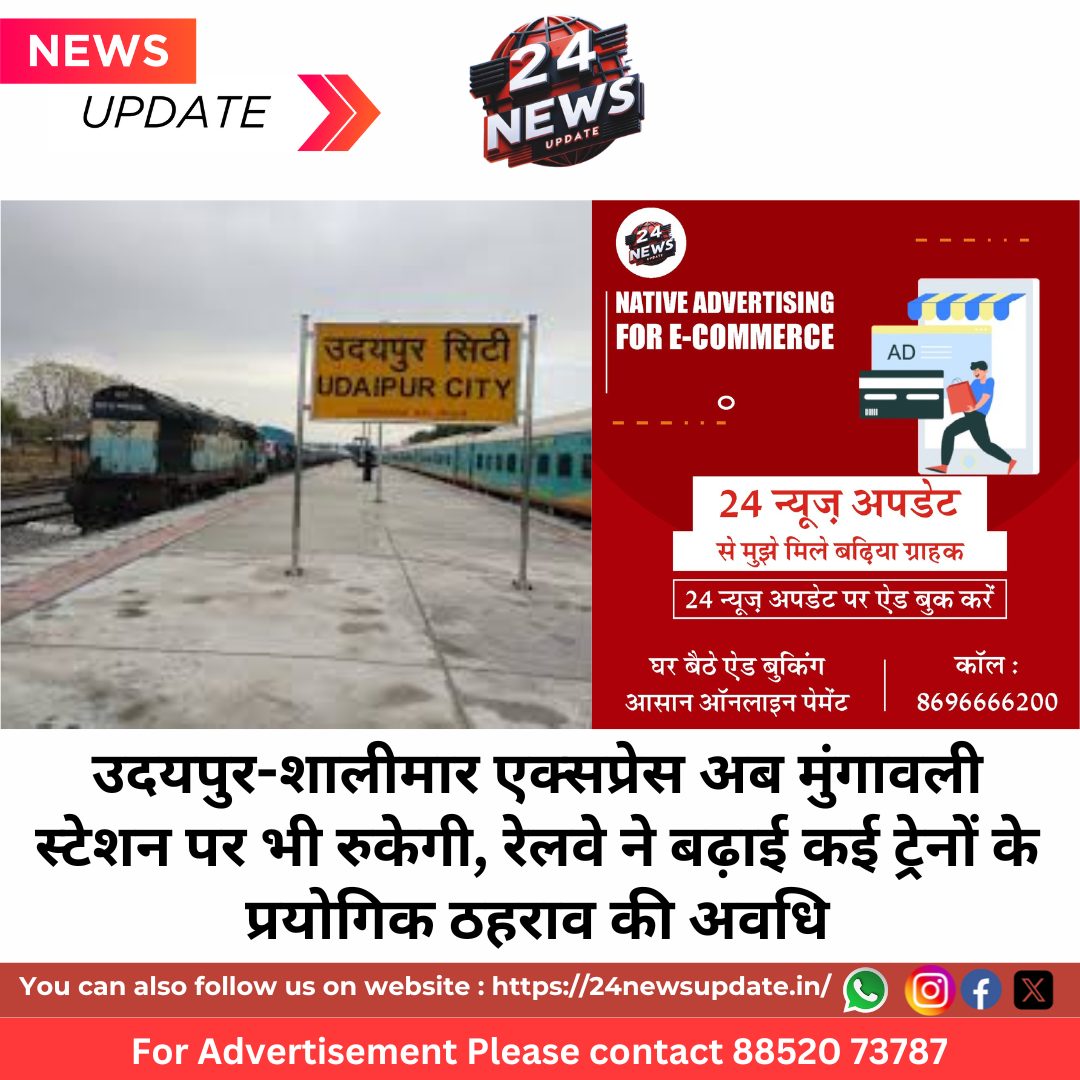 उदयपुरवासियों के लिए राहत की खबर यह है कि गाड़ी संख्या 20971 उदयपुर सिटी–शालीमार एक्सप्रेस और गाड़ी संख्या 20972 शालीमार–उदयपुर सिटी एक्सप्रेस अब आगामी आदेशों तक मुंगावली स्टेशन पर ठहराव करेंगी। इस निर्णय से न केवल मध्य प्रदेश के मुंगावली क्षेत्र के यात्रियों को फायदा होगा, बल्कि उदयपुर और कोलकाता (शालीमार) के बीच सफर करने वाले यात्रियों को भी बीच के स्टेशनों पर और सुविधाएं मिलेंगी। रेलवे द्वारा जारी आदेश के अनुसार, जिन रेलसेवाओं के प्रयोगिक ठहराव में विस्तार किया गया है, उनमें प्रमुख रूप से शामिल हैं:गाड़ी संख्या 18573 विशाखपट्टणम–भगत की कोठी एक्सप्रेस – अब अशोक नगर स्टेशन पर ठहराव।