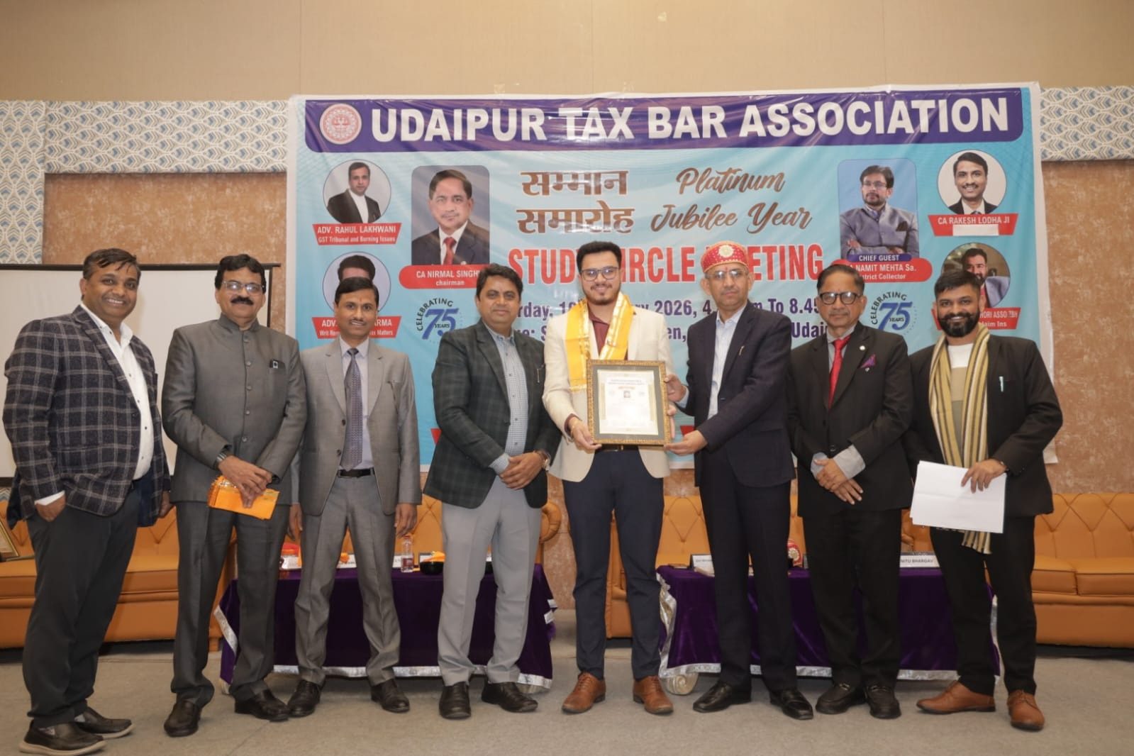 24 Nerws Update उदयपुर। उदयपुर टैक्स बार एसोसिएशन ने अपने 75वें स्थापना वर्ष (प्लेटिनम जुबली) को यादगार बनाते हुए शुभ केसर गार्डन में स्टडी सर्किल मीटिंग एवं सम्मान समारोह का भव्य आयोजन किया। कार्यक्रम की शुरुआत दीप प्रज्वलन, सरस्वती वंदना और राष्ट्रगान के साथ हुई, जिससे पूरा वातावरण गरिमामय बन गया। संस्था के वरिष्ठ सदस्य सीए राकेश लोढ़ा के आयकर अपीलीय अधिकरण (ITAT) के माननीय सदस्य के रूप में चयनित होने तथा उनके 57वें जन्मदिवस के उपलक्ष्य में विशेष सम्मान किया गया।