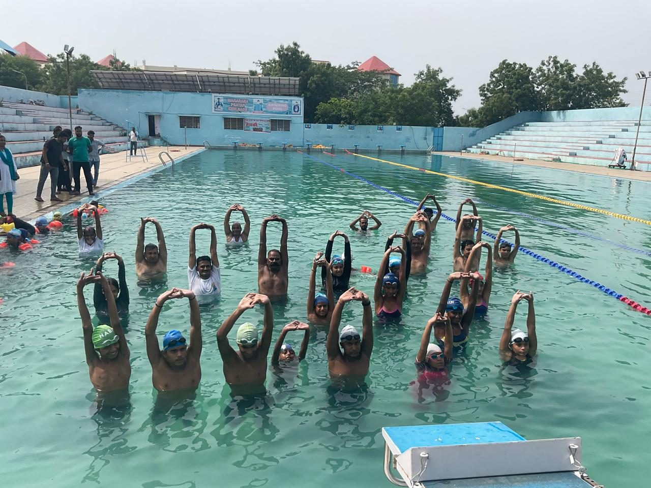 खेलगांव तरणताल परिसर में डॉ. महेश पालीवाल के निर्देशन में एक्वा योग कराया गया, जिसमें जल के भीतर योगाभ्यास करते हुए विशेष आसनों का प्रदर्शन किया गया।