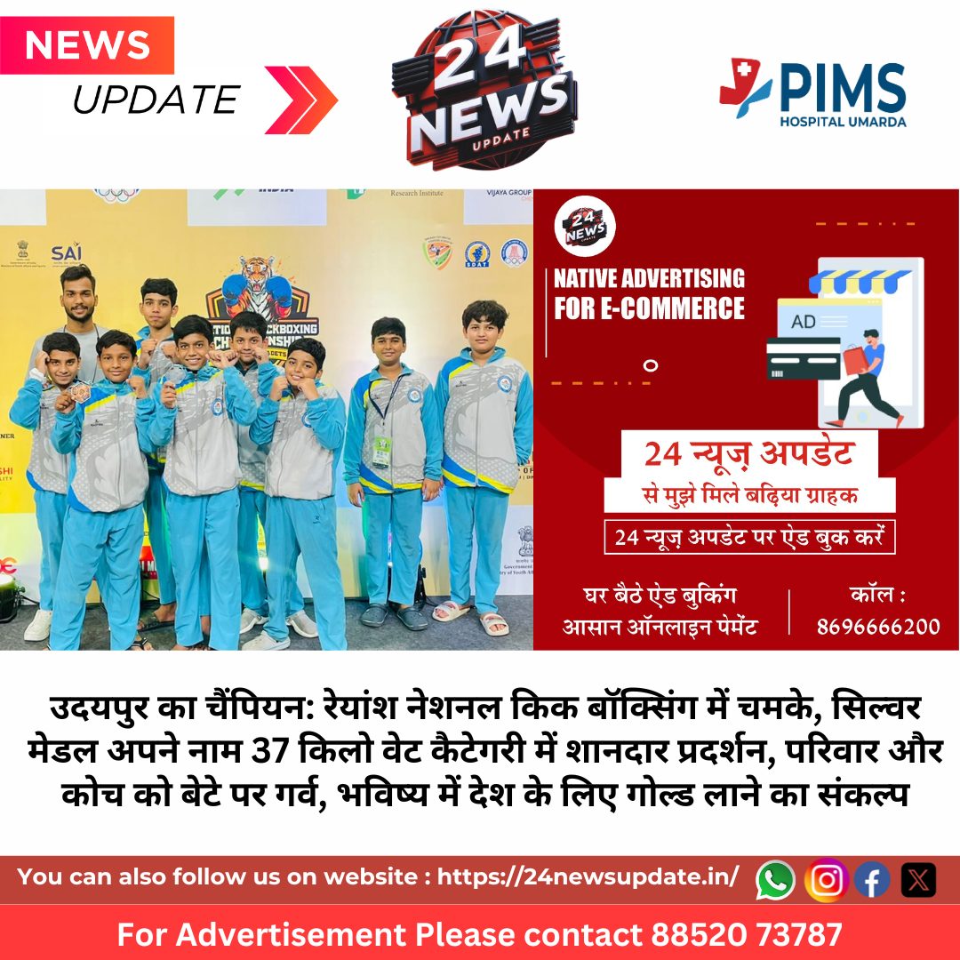 24 News Update उदयपुर। उदयपुर के बड़गांव क्षेत्र की न्यू महालक्ष्मी नगर कॉलोनी निवासी रेयांश उपाध्याय ने नेशनल किक बॉक्सिंग चैंपियनशिप 2025 में शानदार प्रदर्शन करते हुए सिल्वर मेडल जीतकर राजस्थान का नाम रोशन किया है। यह प्रतियोगिता चेन्नई में आयोजित हुई थी।