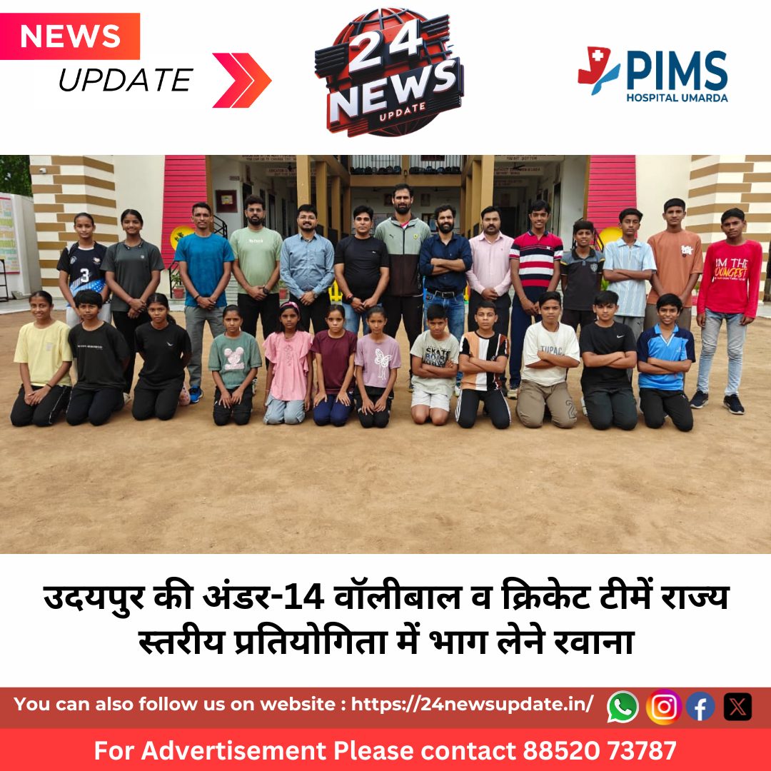 24 News Update उदयपुर। जिला स्तरीय स्कूली खेलकूद प्रतियोगिताओं में उत्कृष्ट प्रदर्शन करने के बाद उदयपुर की अंडर-14 वॉलीबाल और क्रिकेट टीमें राज्य स्तरीय प्रतियोगिता में भाग लेने के लिए रवाना हुईं। वॉलीबाल टीम 30 सितंबर से 6 अक्टूबर तक जोधपुर के लुसेंट स्कूल थोब ओसिया में मुकाबलों में हिस्सा लेगी, जबकि क्रिकेट टीम सेंट पॉल सीनियर सेकेंडरी स्कूल, फालना में आयोजित प्रतियोगिता में भाग लेगी।